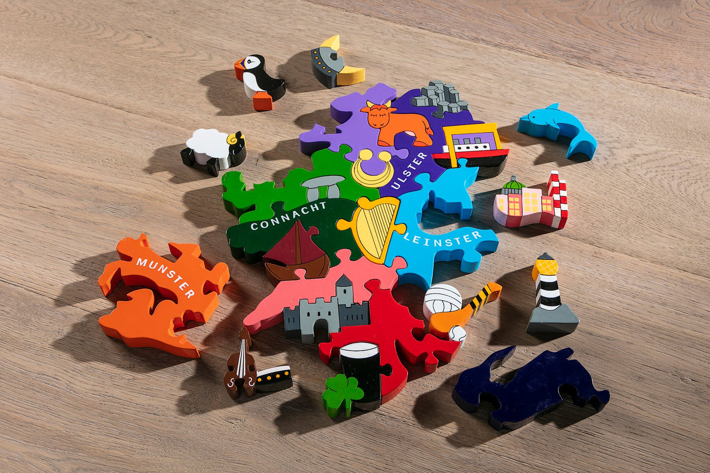 Our New Ireland jigsaw puzzle is a wonderful introduction to the rich natural and cultural heritage to be found on our shores. Individual pieces show many of Ireland's national treasures and traditions as well as some of our more celebrated wildlife. The Map also shows the 4 provinces of Ireland and some important landmarks: