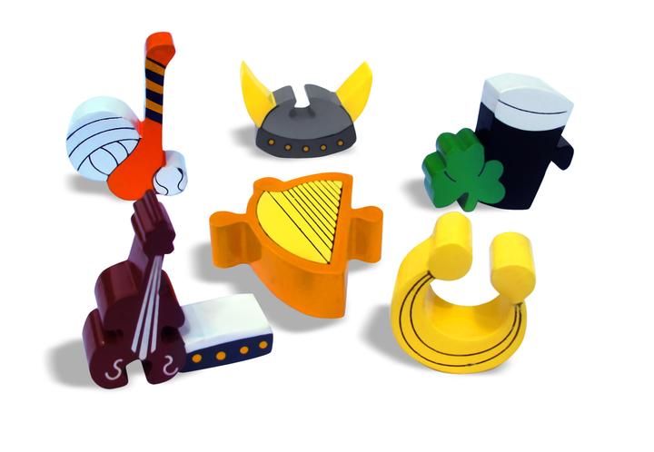 A Harp, Dublin's Pigeon Loft and 4 Courts, a Galway Hooker, The Titanic, The Giant's Causeway, a Dolmen, a Fiddle and Bodhran, Hook Head Lighthouse, a Viking Helmet, a Puffin, a Sheep, a Cow, Fungy the Dolphin, The Glensheen Collar, A Hurl, Sliotar and Football and finally a pint of the black stuff!
