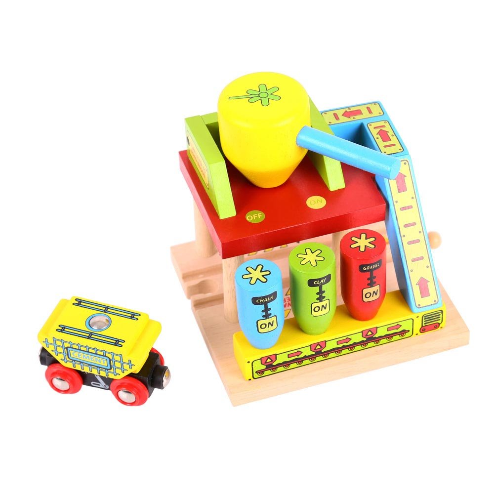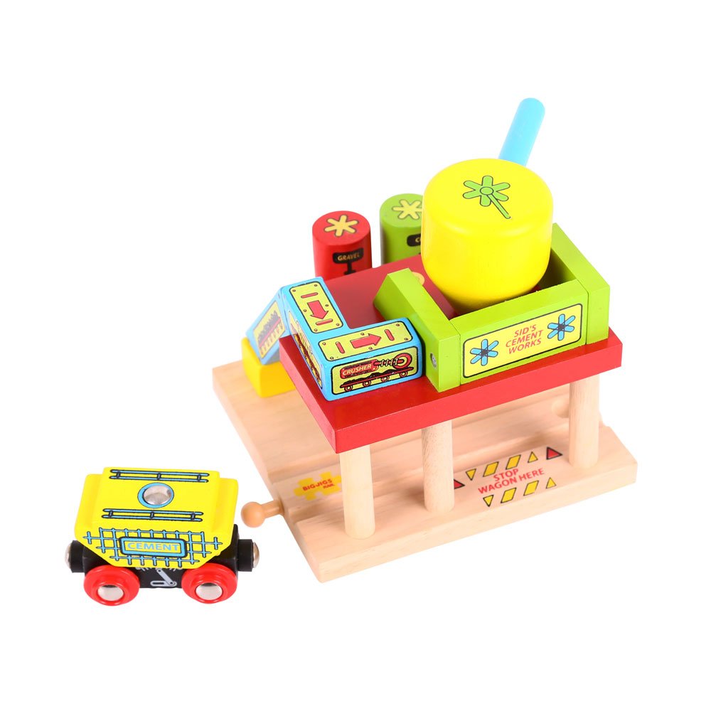 Bigjigs Rail Cement Works enhances and expands any wooden railway track layout, and helps industrious young minds understand the processes involved in commercial transportation. The colorful 3-piece set includes an elevated cement mixing station and a 2-piece wooden freight car labeled ''Cement.'' The freight car features a removable load that can be lifted off with a Bigjigs magnetic crane (sold separately). Young engineers can position the wooden freight car under the loading dock and pretend to load it up with cement, then continue on the journey. This detailed set makes a wonderful addition to any collection.