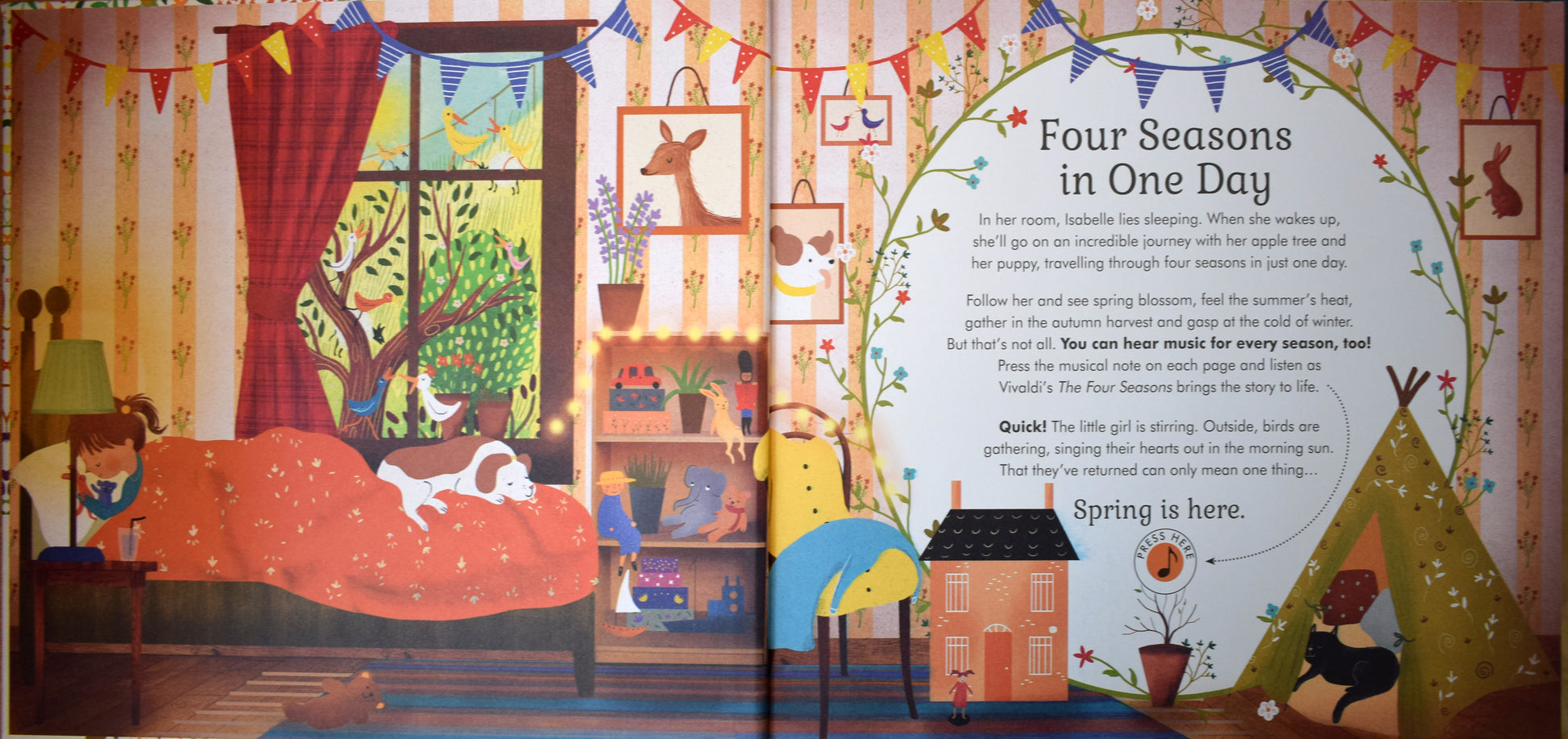 Discover what it would be like to travel through the four seasons in one day, following a little girl called Isabelle and her dog, Pickle, as they take on the adventure of a lifetime. As a sign of the changing seasons, Isabelle carries a little apple tree with her, and we see it bud, blossom and lose its leaves. Accompanied by pieces from Vivaldi's Four Seasons, this is the first title in a series of sound books that bring classical music to life for young children.