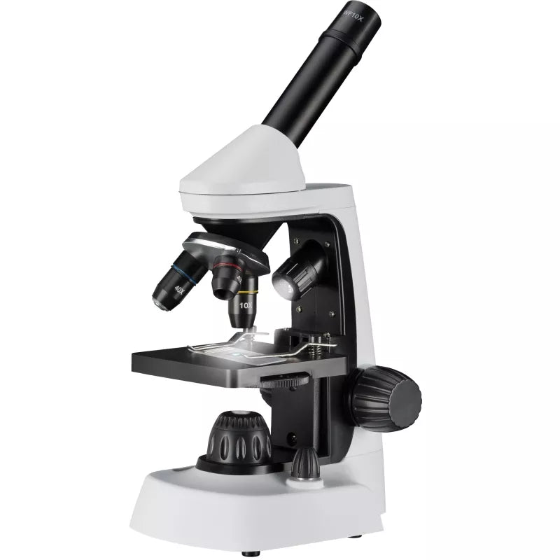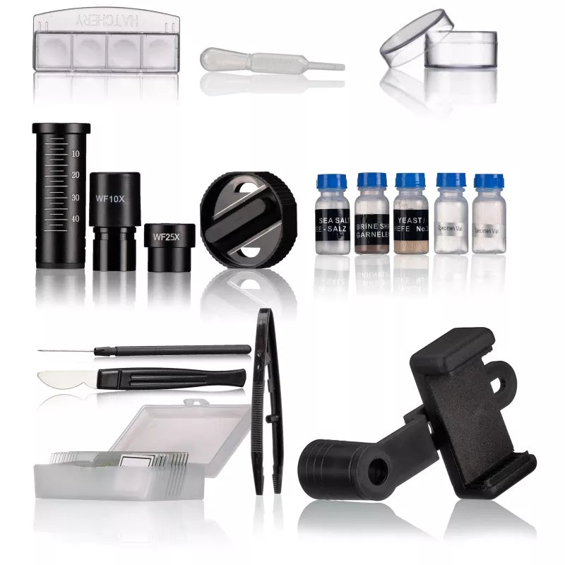 To ensure you're fully equipped, the accessories included provide the perfect introductory equipment. This includes, among other things, two wide-field eyepieces, a colour filter disk, many slides and storage containers. With its elegant Bresser design, the microscope has many useful features .