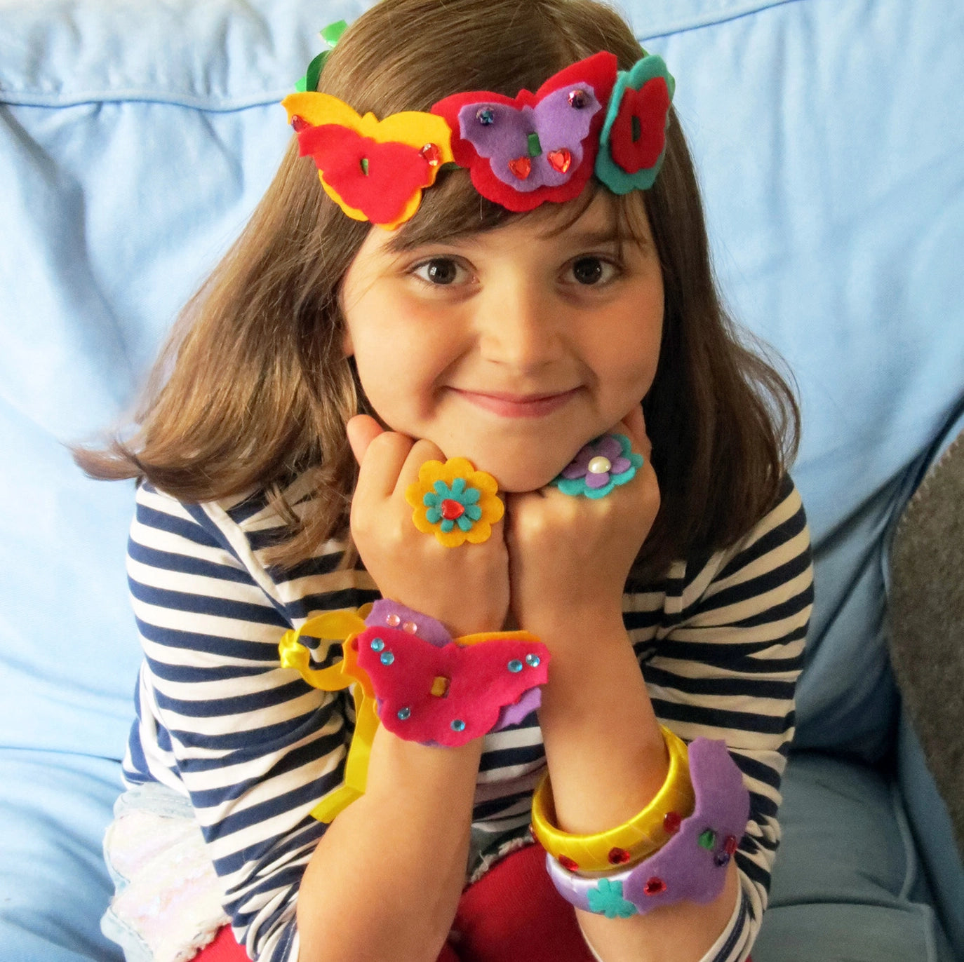 You can make headbands, belts, & necklaces or decorate a wooden bangle with sticky flowers & jewels. Everything you need to start is in the case which also makes great storage place for all your crafty materials.