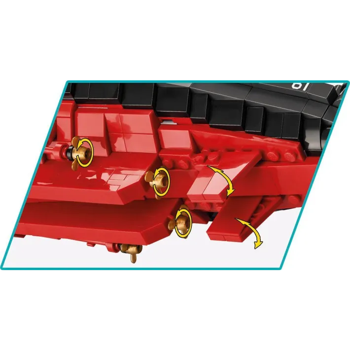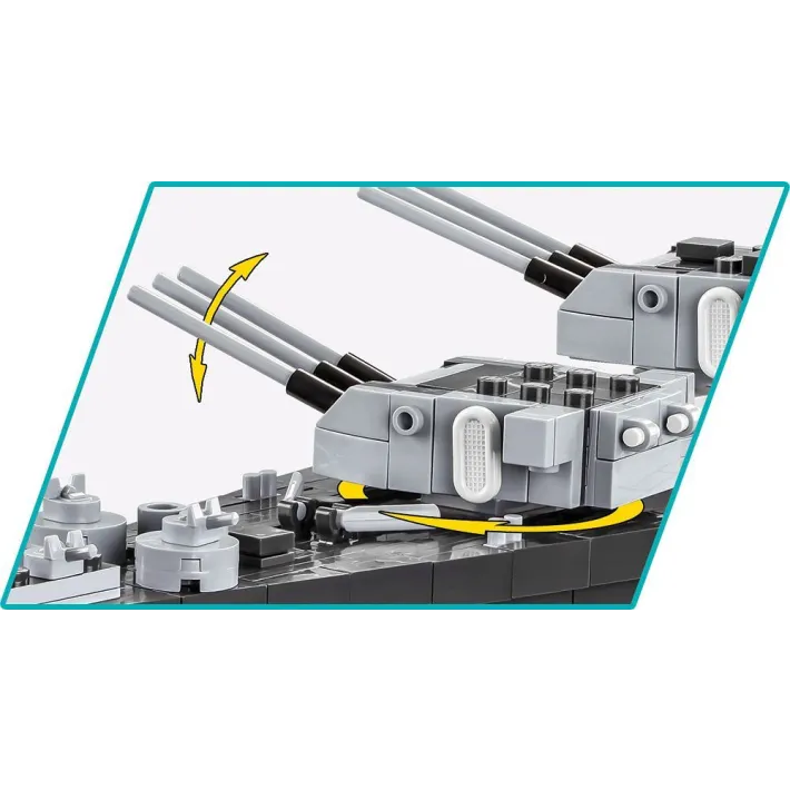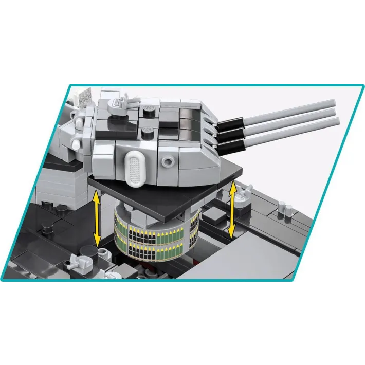 A model made of COBI construction blocks in a scale of 1: 300 is a real challenge for all builders. It consists of 2655 elements and requires several hours of intense and exciting assembly. It is exactly 92 cm (36.2 ") long and 20.5 cm (8") high. It has movable elements such as artillery turrets and gun barrels, propellers and a rudder. High-quality prints make it possible to capture even more details that make the block-shaped ship look very attractive! Thanks to the intuitive instructions based on detailed illustrations, the construction is simple and does not cause any problems. The set includes a special block display stand with the name of the ship printed on the plate. The ship looks very impressive on it, no one will be unimpressed! The legendary USS Missouri will be a unique decoration of each collection of history, maritime vessels and military enthusiasts. Build history, piece by piece, with COBI.