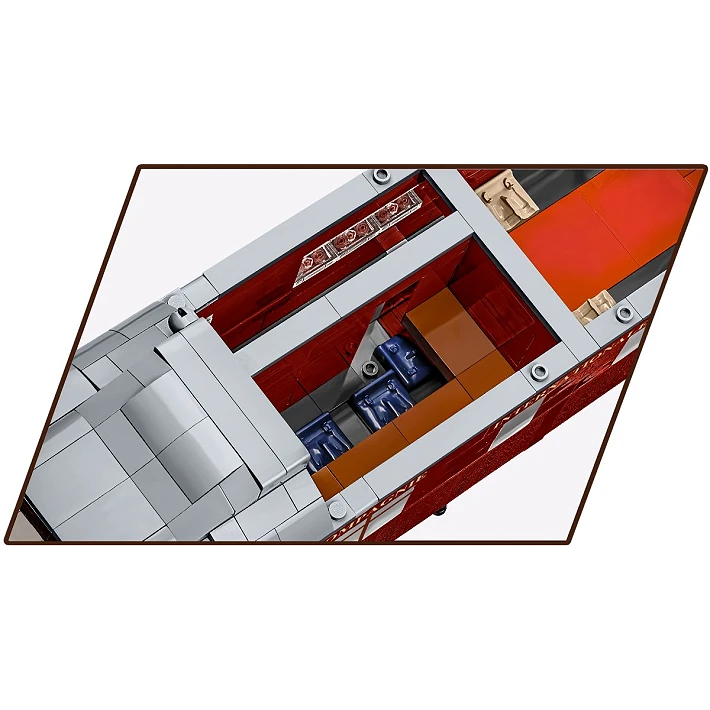 The wagon, measuring almost 60 centimeters, is a completely new design in the railway series from COBI. Behind its textured sides there is a perfectly reproduced interior, which can be easily seen after removing the roof. The aforementioned sides are covered with new, long blocks with a wood texture and prints, thanks to which the wagon looks just like the original. The gold prints show the Compagnie Internationale des Wagons-Lits logo, the wagon number and the elaborate slogan above the windows. The wagon has opening doors on the sides, on its front walls in the passages between the wagons and inside between the subsequent sections. The interior of the wagon shows Ferdinand Foch's saloon. The wagon's interior is the same as in November 1918. The set includes two figures representing both sides that signed the armistice. On the German side it is Matthias Erzberger, and on the French side Marshal Ferdinand Foch.