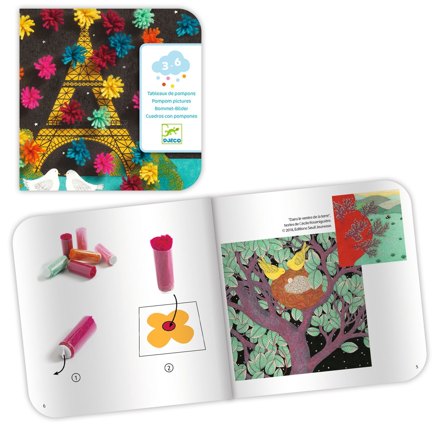 Small adhesive cylinders to complete 4 pretty illustrations. The child glues the tubes on the board then removes the transparent part and ? surprise ? colourful pompoms appear! Features: A collage activity from the age of 3. More than 160 surprise tubes! The pompoms are self-adhesive. An explanatory booklet in colour with pictures only. Develops precision and fun Learning colours. Contents: 4 illustrated cards (21 x 28 cm), 168 tubes with a self-adhesive end that releases a pompom, and 1 explanatory booklet in colour.