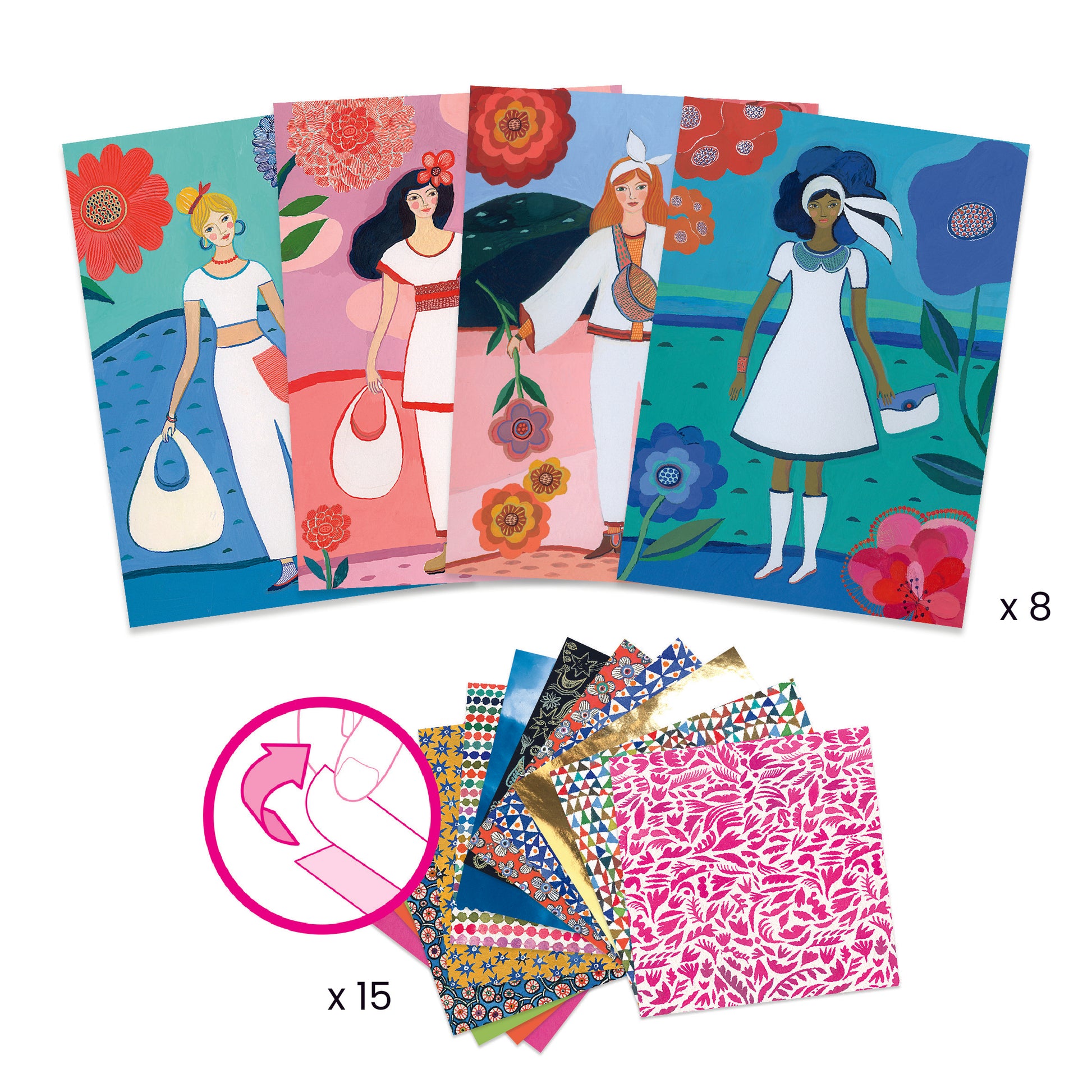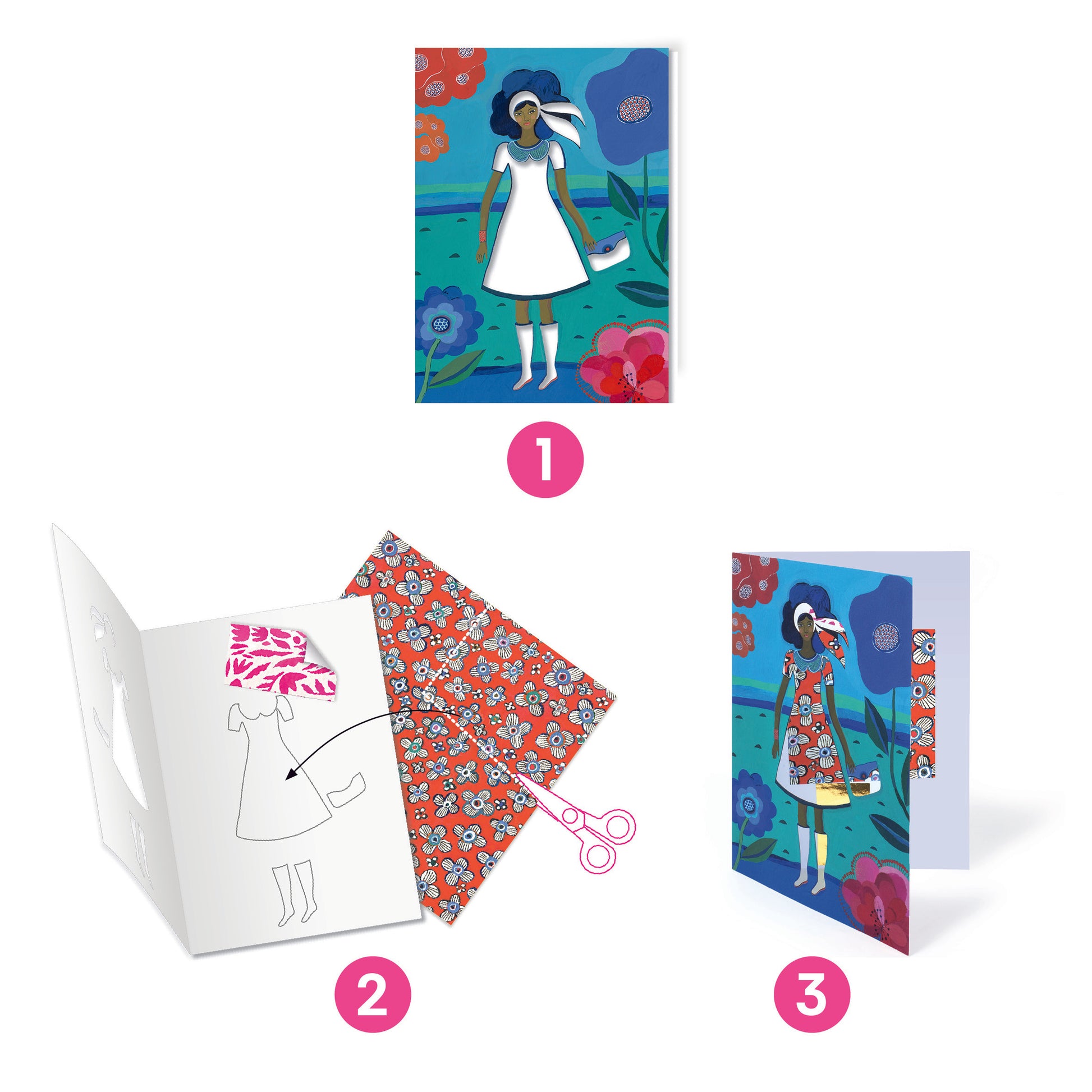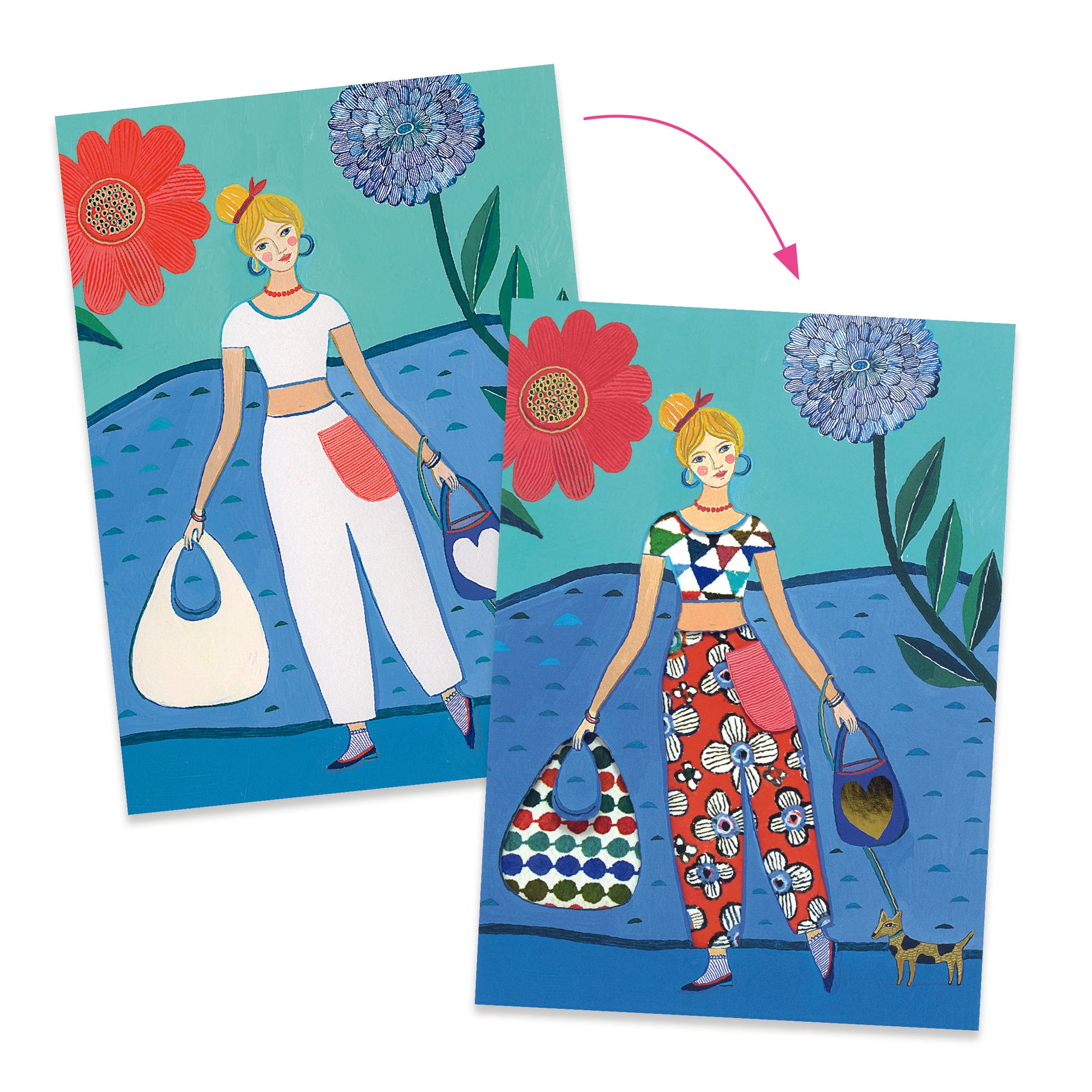 Transform 8 original cards into unique fashion creations! Children can use their imaginations to dress 4 different models using sticker sheets with various patterns (fluorescent, metallic, and more). Once the card is folded over, the magic happens: the model appears, beautifully dressed, in their own scene!