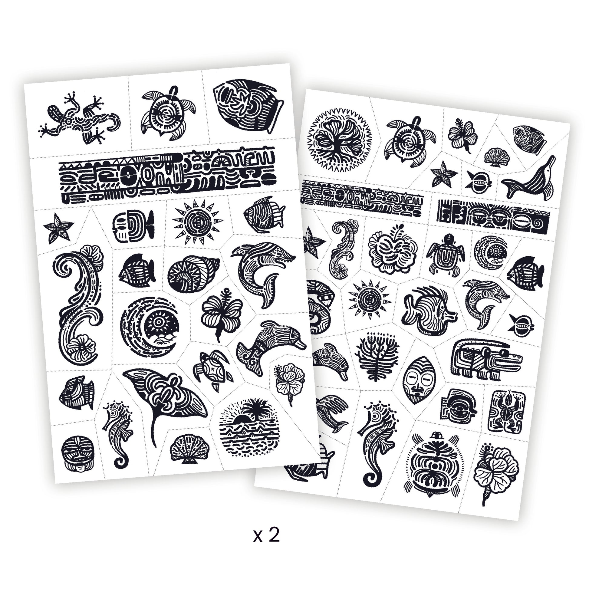 Product Description: Two sheets of temporary tattoos inspired by the famous Polynesian tattoo style. Perfect for that real tattoo look! Patterns with travel and beach vibes!