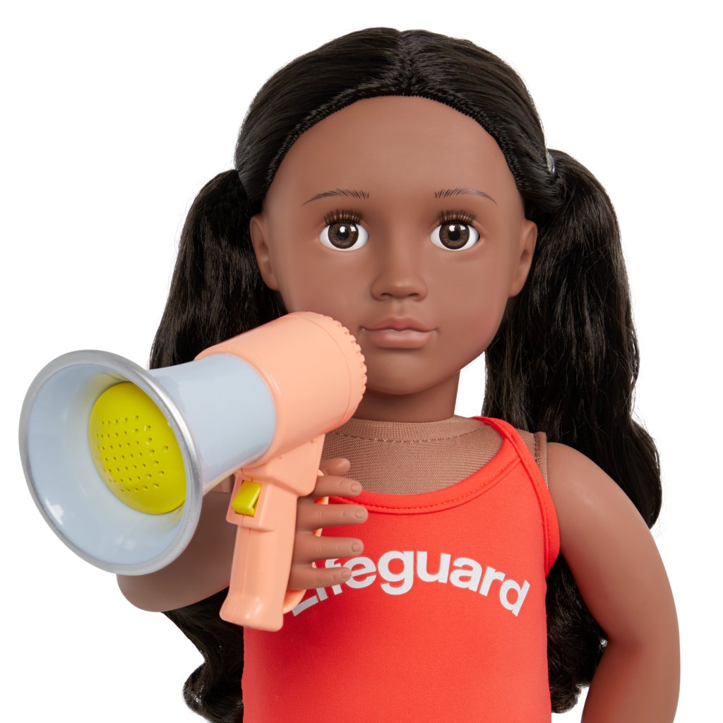 Bring sun, sand, and safety adventures to your Our Generation 18-inch dolls with the Lifeguard Playset! Which of your besties will be the lookout today? Dress them up in the classic red lifeguard swimsuit for everyone on the beach to see. Don’t forget the sunscreen and sunglasses! Keep the whistle around your doll’s neck in case she spots any danger. Or pick up the megaphone to get swimmers’ attention – it really works! Seat your dolls on the realistic lifeguard chair with the pair of binoculars to patrol the waves. To the rescue! Grab the paddle board or life raft when it’s time to save the day. Then dry off with the beach towel and get ready for more lifeguard duties!