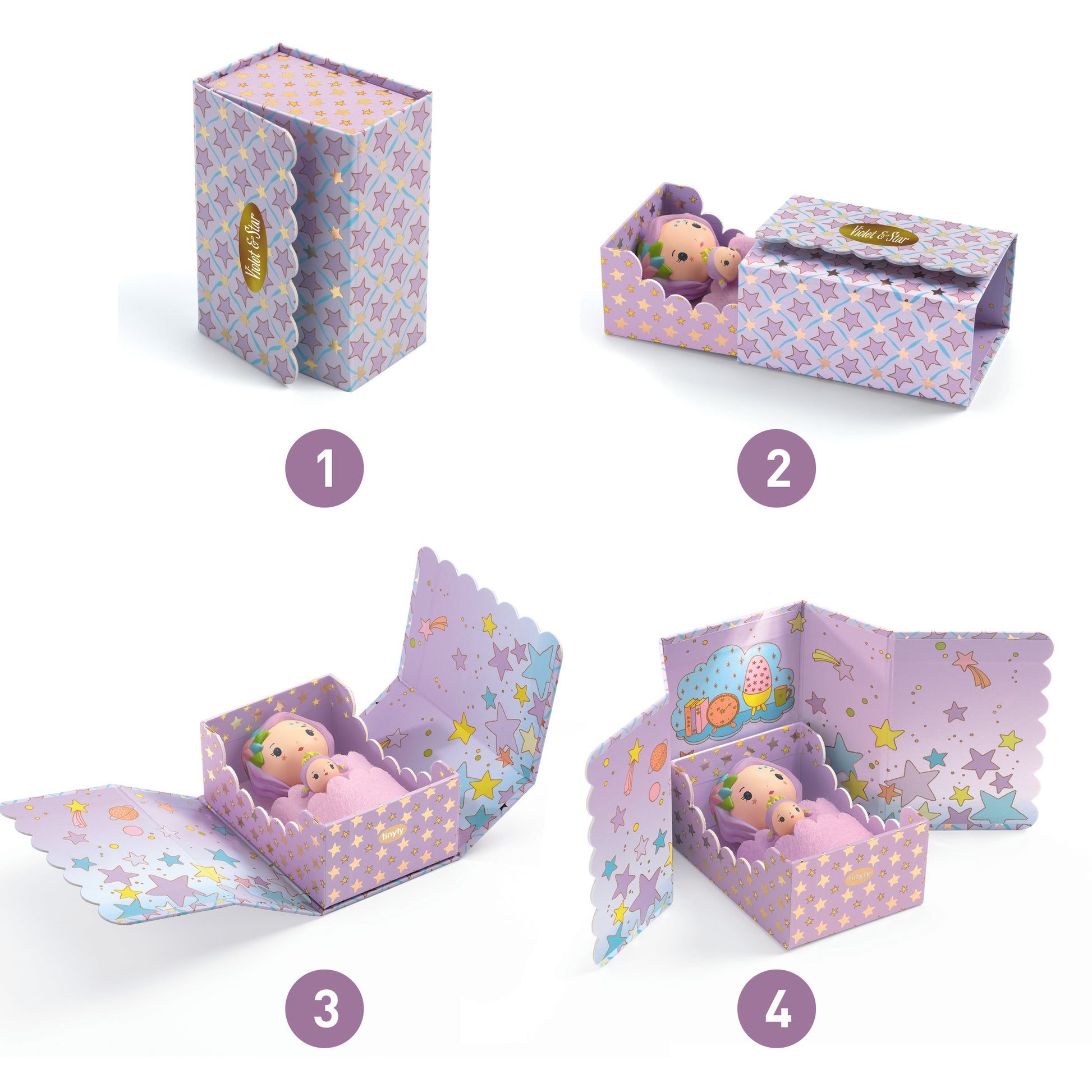 Product Description: Violet and her inseparable companion Star’s tinyroom is an adorable miniature living space. The little box turns into Rose’s bedroom. A lovely bedroom design and a comfortable little bed where the figurines can snuggle under the covers. This starry world filled with sweetness and poetic charm offers a doll’s bedroom design and adds to the portable Tinyly houses. Features: An entire miniature bedroom design. A magnetic box so you can take your tinyroom anywhere. - - - - Contents: 1 box containing 1 figurine, 1 companion, 1 bed, 1 screen and 1 felt cover