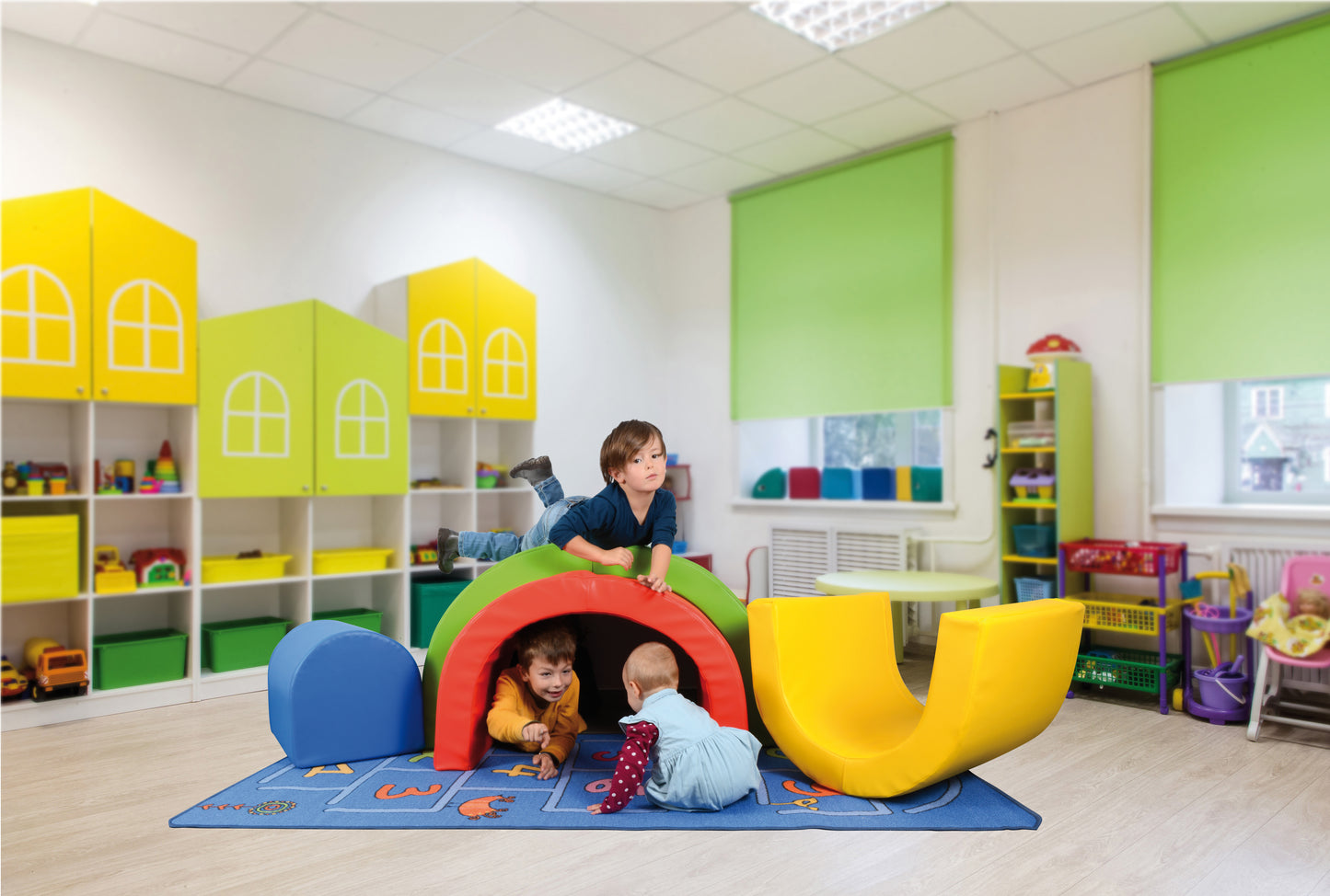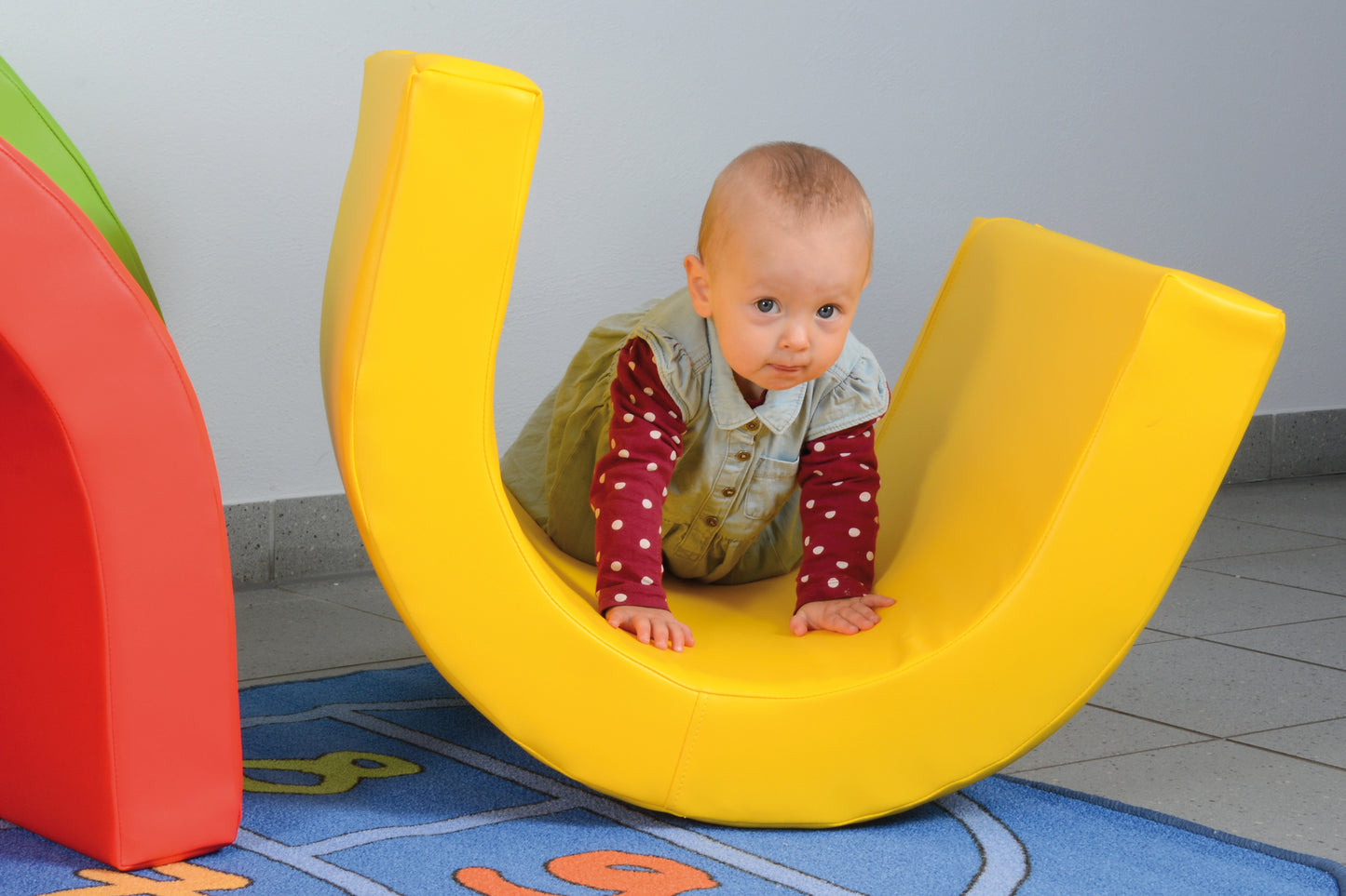 ... play cave, crawling tunnel, baby bouncer,... the colorful rainbow building blocks are used in many activities and also for therapy. Thanks to the stable foam core (RG 25), children can also crawl over it or sit on it. The durable artificial leather cover can be wiped clean. Set: 4 arched soft building blocks.