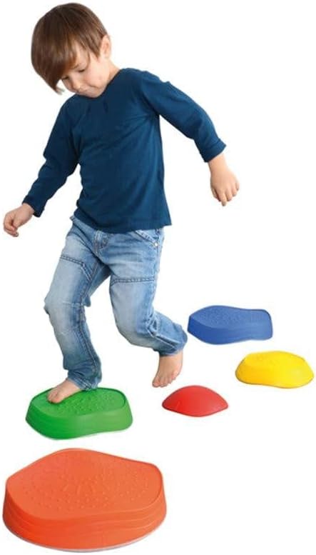 The indoor balancing path ... The five river stones are quickly assembled into a balancing path and can also be combined with other materials, e.g. sensory mats, to create a course. Depending on the distance between the stones and the different sizes and heights, the level of difficulty can be varied for children of different ages. Balance and coordination are trained. The knobs on the top also stimulate sensory perception. The rubber lip on the underside makes the river stones non-slip on smooth floors. Stackable inside each other for space-saving storage. Maximum load up to 50 kg. Material: thermoplastic synthetic material