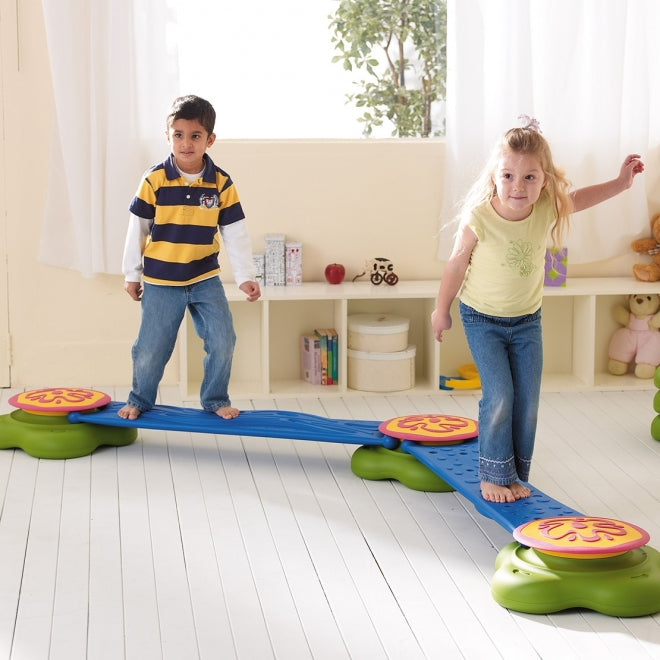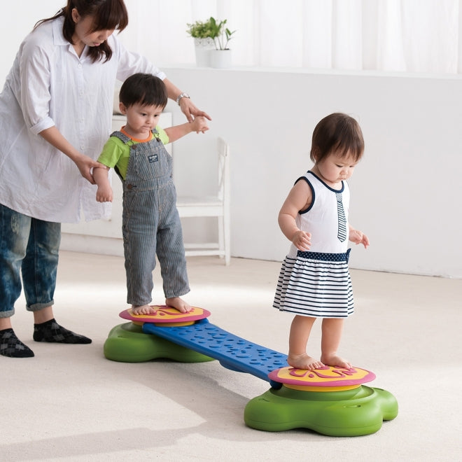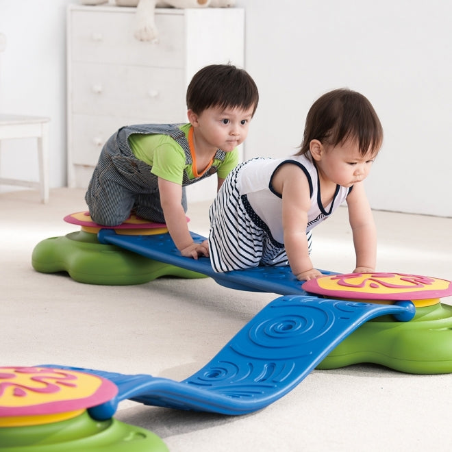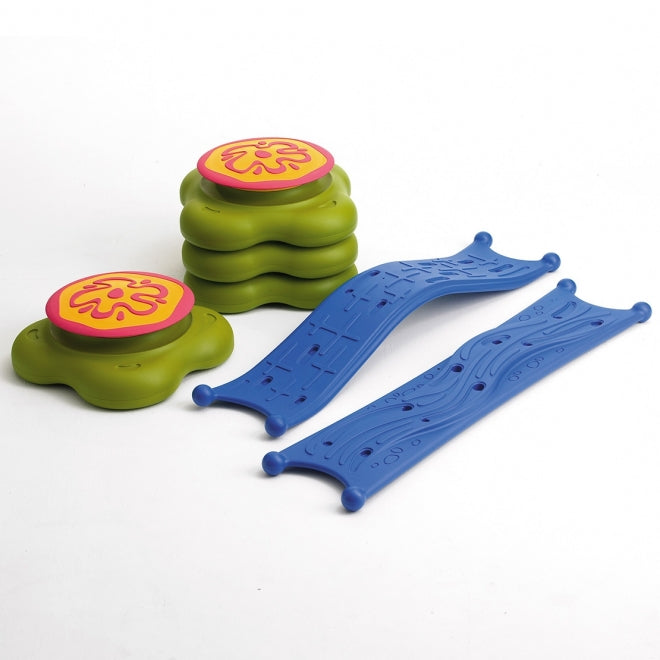 The development of motor skills ... and mental conditions can be improved by playing Water-Lily. Inspired by a pool of water lilies, this product consist of green stackable islands and blue bridges. There are different textures on the bridges and islands, such as petals, bubbles, waves, ripples and sparkles. Anti-slip material is a big breakthrough for good safety. Children can freely create lots of amazing paths and situational activities with these beautiful components. Enhance physical coordination, dexterity and balance development. The arrangements of various games help children cultivate spatial concept and improve their action planning and problem solving abilities. Content: 4 x island, 1 x flat bridge, 1 x curvy bridge. Material: PE, PP, TPE Measurements: island: 52 x 52 x 16.6 cm, flat bridge: 115 x 26.6 x 5.3 cm, curvy bridge: 115 x 26.6 x 16.6 cm Age restriction: 2 years & up