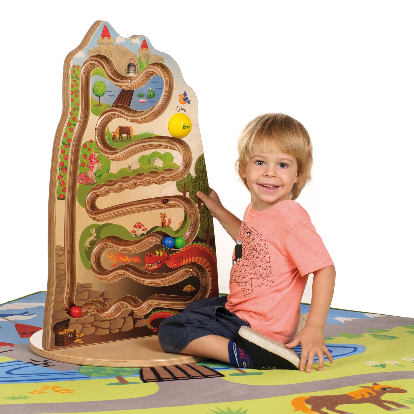 Affixed to the wall of a group play area, a waiting room, a foyer or anywhere else, Erzi marble tracks never fail to catch the eye: Three gaily coloured wooden marbles appear to be waiting impatiently to embark on tour of an enchanted forest. On their way past castles and dragons they experience all kinds of adventures. The marbles always remain on track. The marble track can be set up freely around the room using the included Erzi Base Plate