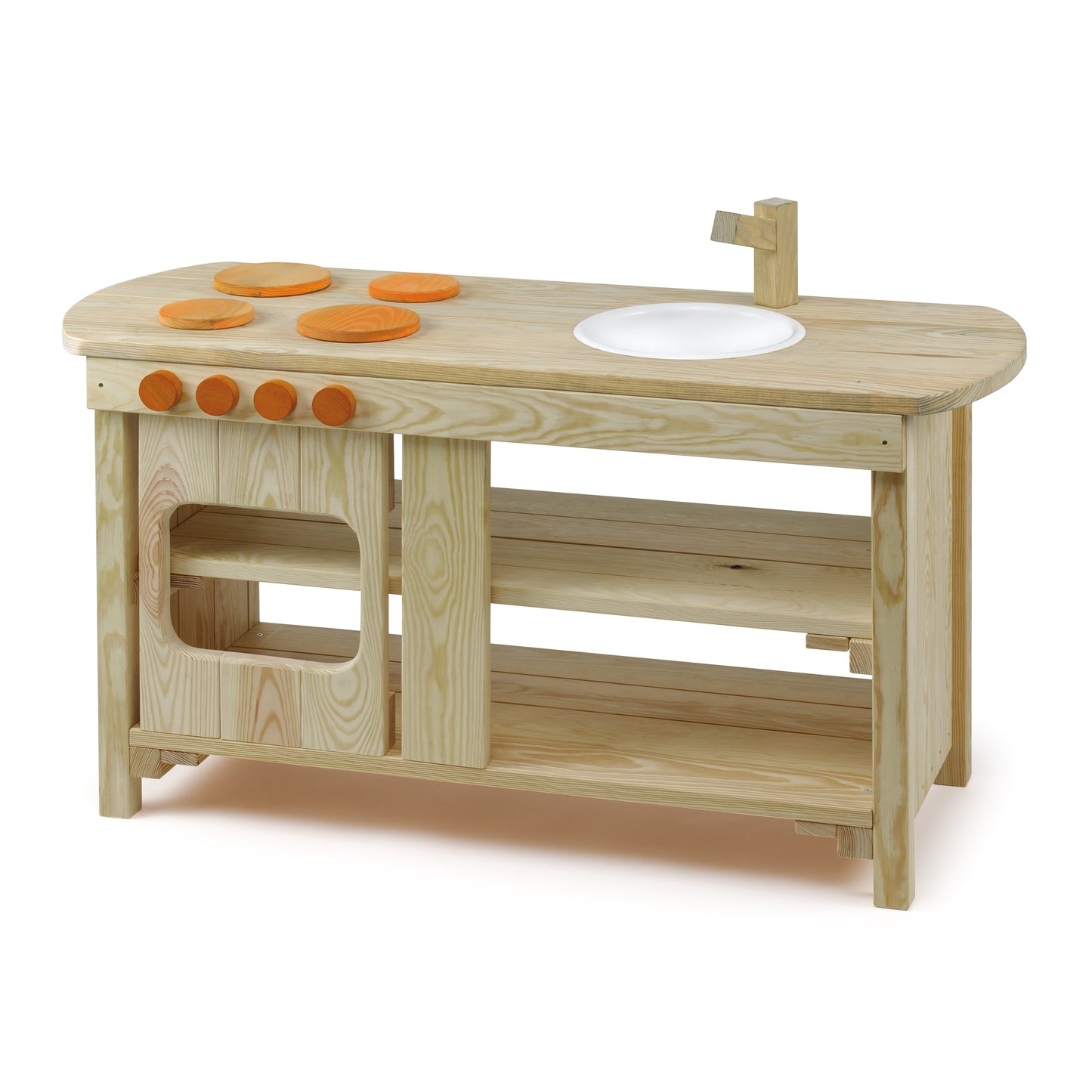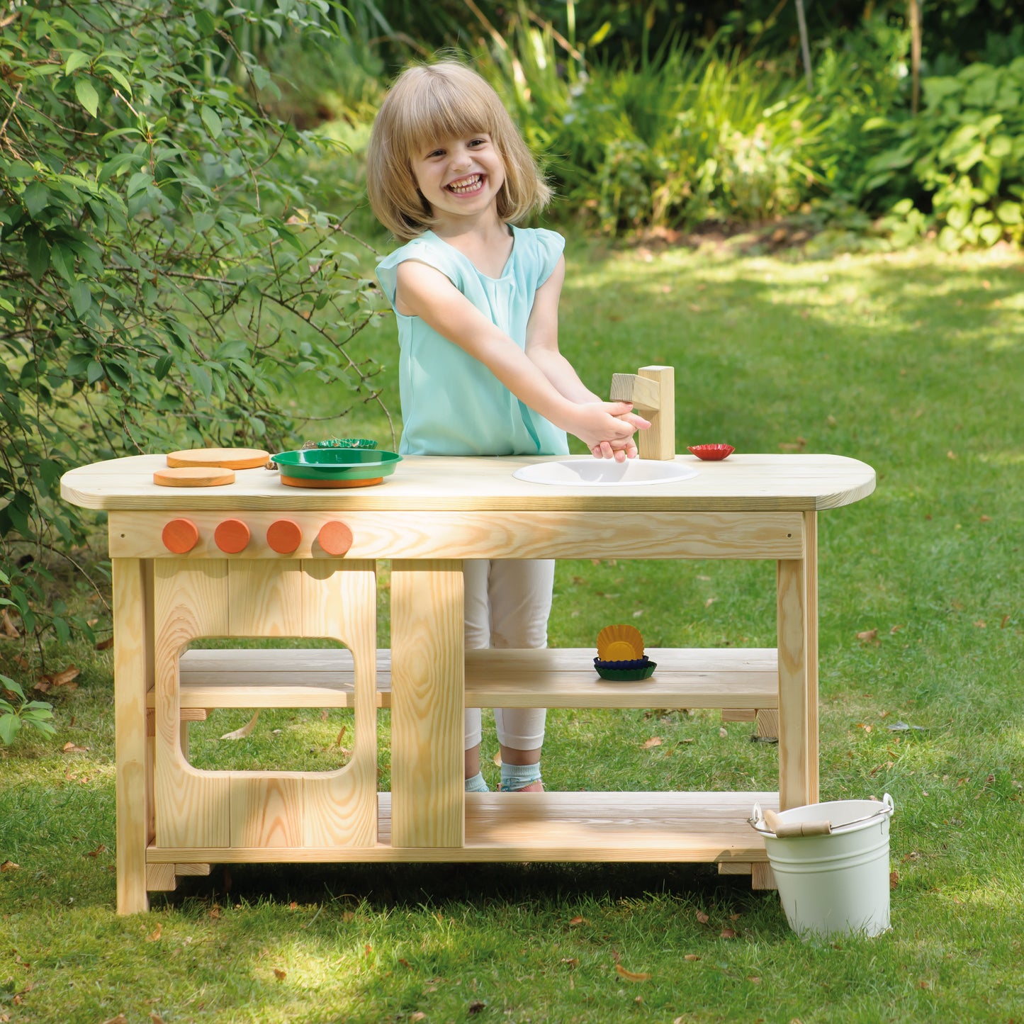 The Erzi Outdoor Play Kitchen provides children with the opportunity of their lives for practising this fascinating role-playing game outdoors in the garden, where use can be made of natural materials. The kitchen can be used for playing on either side and comprises a cooker, kitchen sink and lots of shelving.