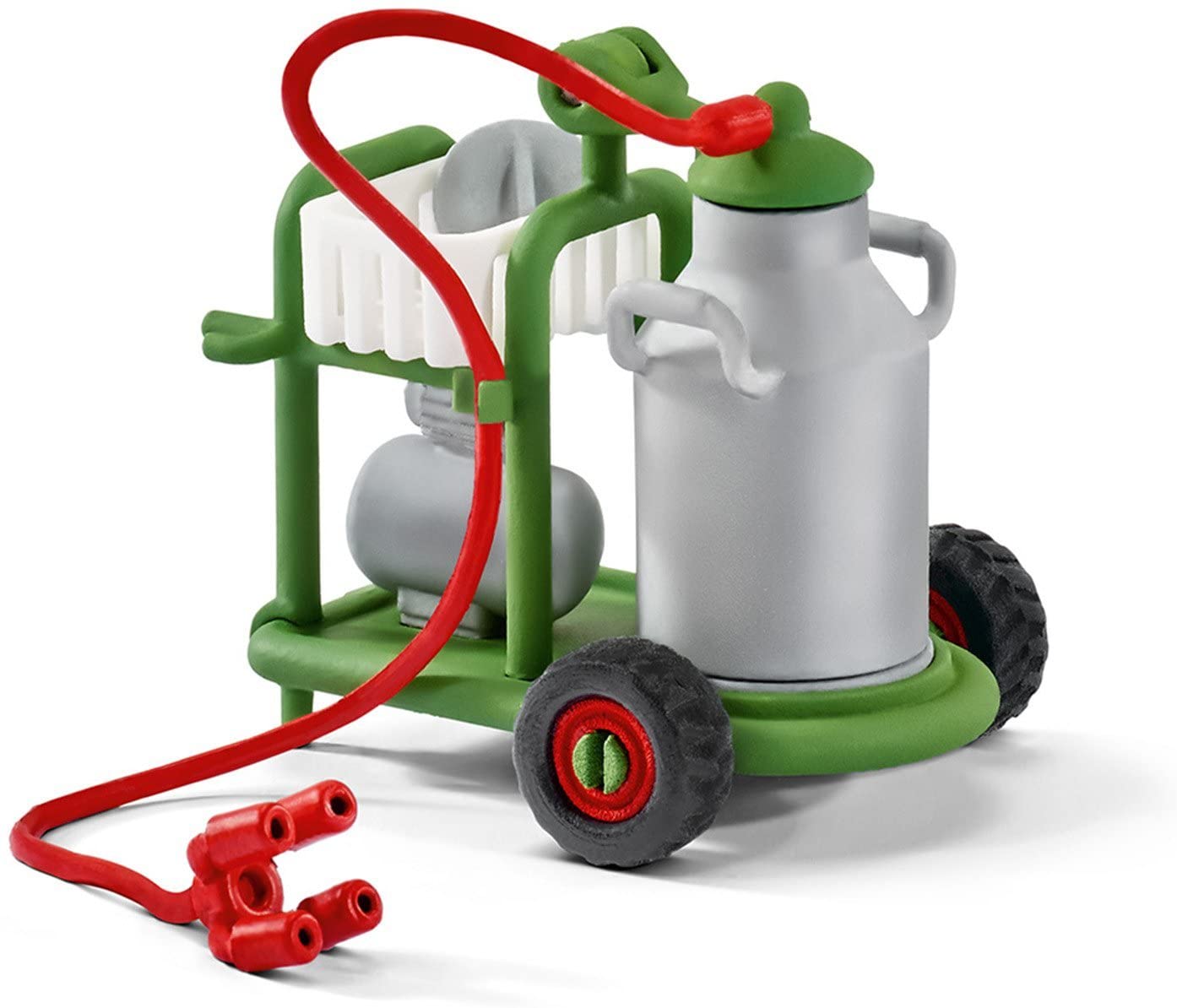 Milking time on the farm. Set includes cow and calf, 8 pieces of wire fencing, figure with articulated arms, milking apparatus with udder attachments, tanker that can be filled and dispense water, plus a bunch of carrots.