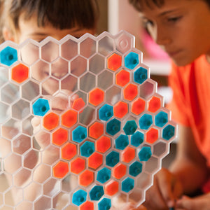 - Take turns sticking hexagonal suction cups of your color onto the vertical, translucent game board