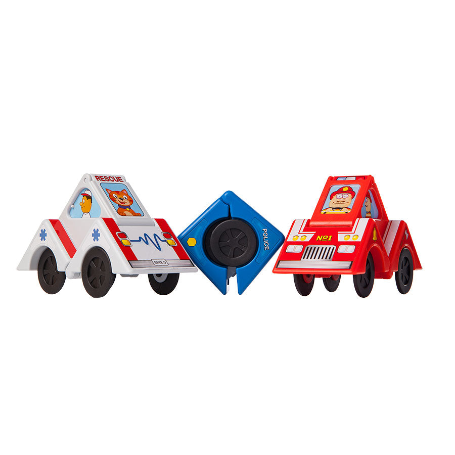 Grab onto the corners near the wheels of each cube and pull them apart one by one - Click, swish, snap, WOW! - They suddenly transform into three fast-rolling rescue vehicles!