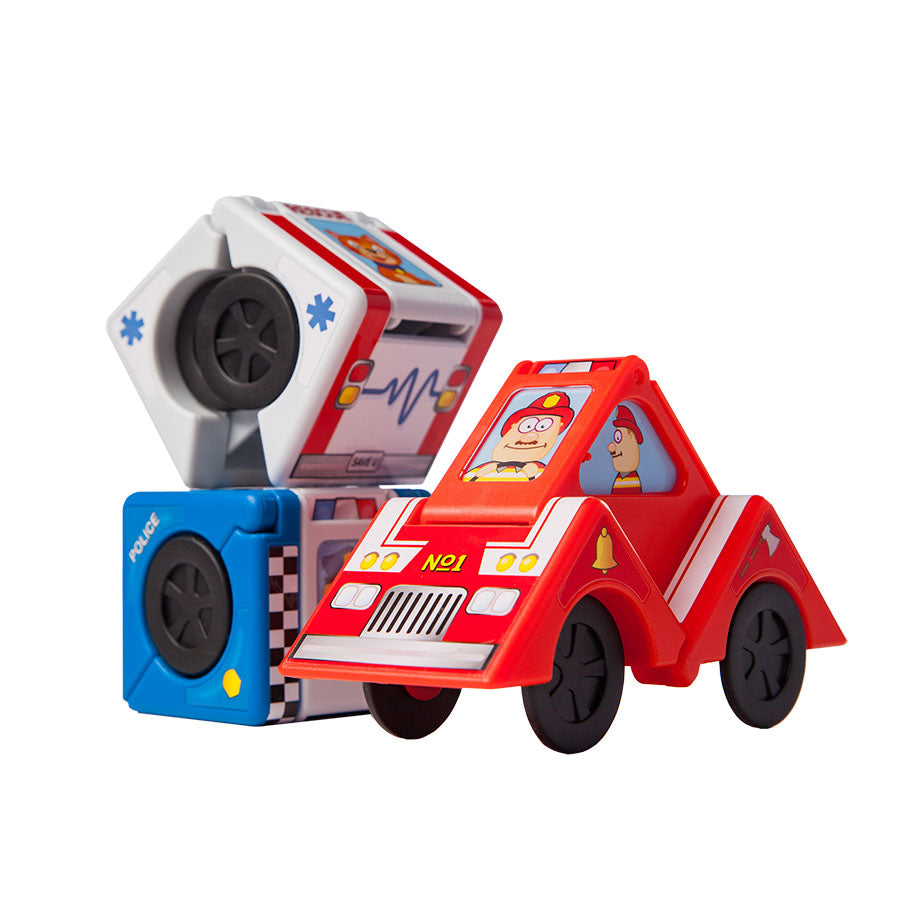 • Set of 3 colorful cubes that unfold to transform into 3 rescue vehicles