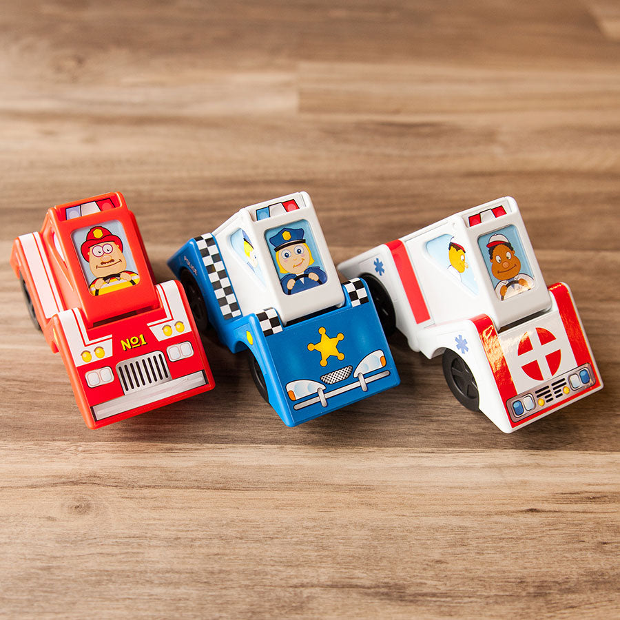 Chase after criminals with the police cruiser, respond to the call with the firetruck, and race to the rescue with the ambulance.