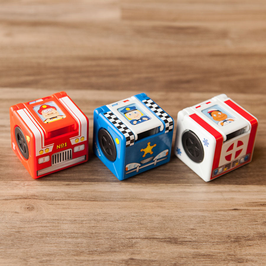 Each side of these vibrant cubes features another detailed part of a rescue vehicle - Headlights, break lights, a windshield, two spinning wheels on either side, and a rear window.