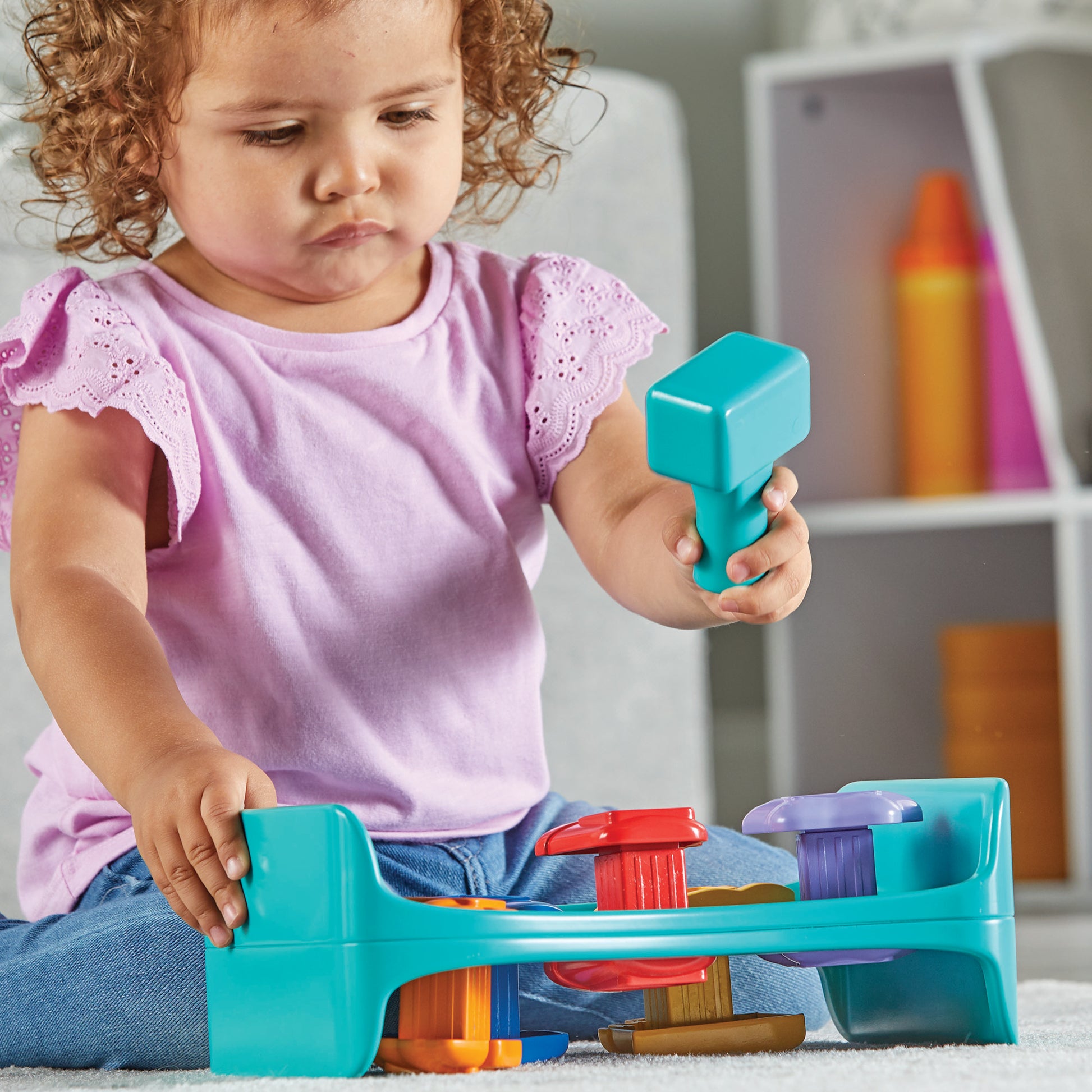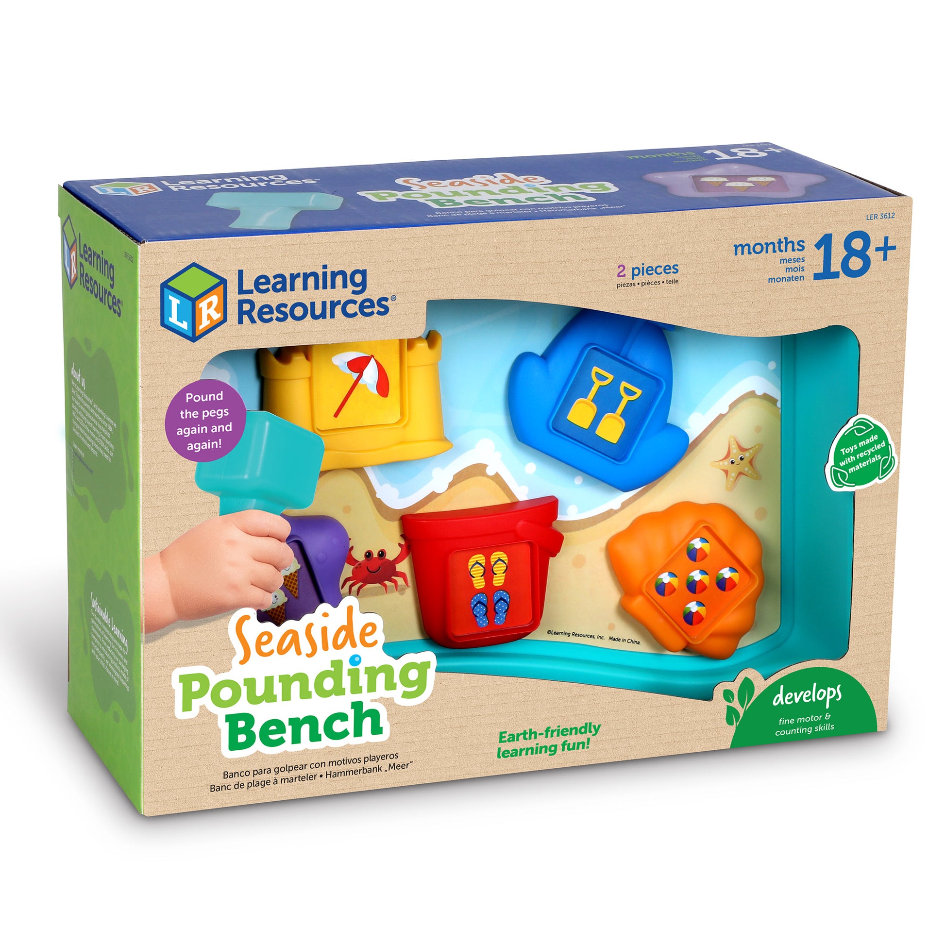 Learning Resources® Seaside Pounding Bench Turn a trip to the seaside into a fun fine motor adventure! Little hands build strength, dexterity and hand-eye coordination as they play with this colourful, beach-themed fine motor skills toy. Little hands grab the child-safe hammer and use it to pound the 5 colourful pegs. Each has a different shape, and shows a number on one side, and a corresponding number of seaside themed objects on the other side of the peg. Hammer them through, and then turn the bench around to hammer them back again.