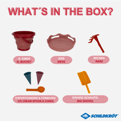 What parent isn't familiar with the problem of having their suitcases or car packed and still needing to take the normally bulky sand toys with them on vacation? Or maybe they're off to the playground and their bag or stroller is already packed. With this compact and innovative 7-in-1 set, Schildkröt presents the solution in a practical handbag format. Developed in Germany, the set is available in two colors (blue & red) and offers unique and innovative functionality with its foldable 3-liter bucket and six additional sand toys for digging, shaping, sifting, and raking. Its compact size (diameter: 22 cm / height: 8.6 cm) makes the set the ideal companion and fits in almost any bag, suitcase, or even the most crowded car. An extremely robust product design is incorporated into every part of the patented sand toy set. All components are designed for use by several generations of children. The high-quality and biologically safe materials (BPA-free) guarantee a long service life and low environmental impact.