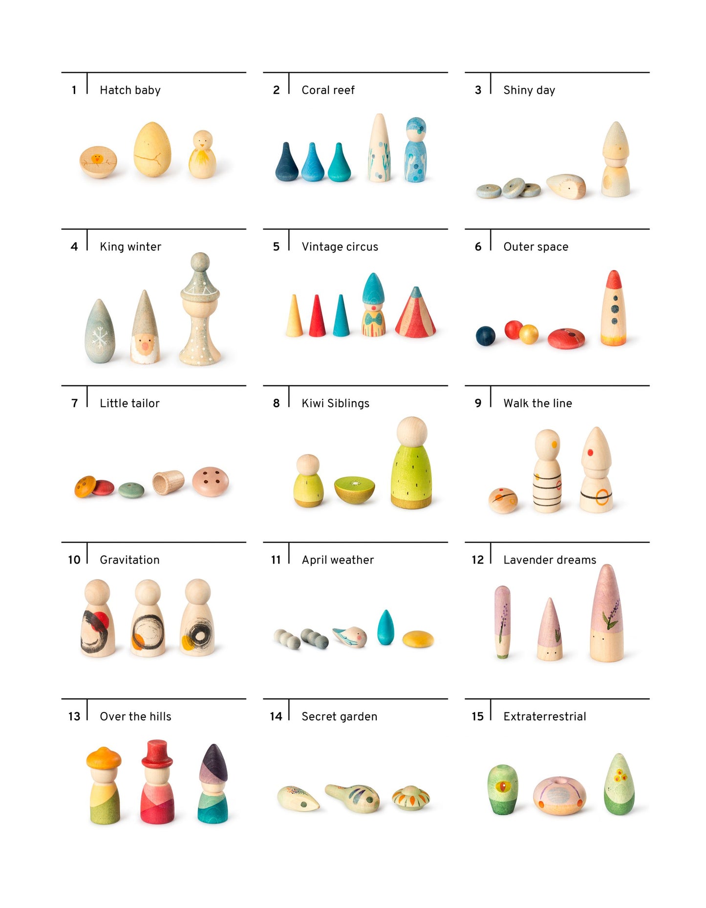 As many of you shared with us your happiness and joy about our Lucky Lucky set, we decided to surprise you with a second edition. Meet our new colourful bunch of little wooden friends we create for you. It was a pleasure to invent new characters and little scenes and we can’t wait to hear which adventures they share with your little ones.