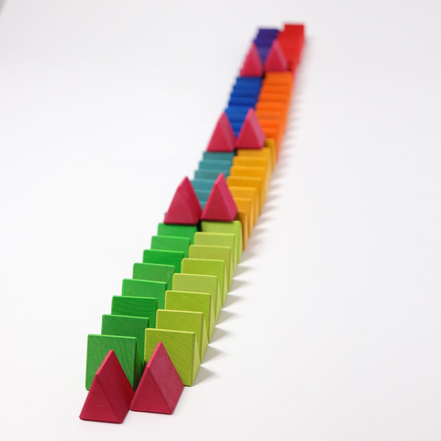 Discover the triangle: From small to large triangle, from hexagon to star what other geometric forms can be created with the triangles? One form provides the basis for so many other forms! Have fun exploring the symmetry of the triangle. You can also create and build animals and, of course, structures for playing with dolls and cars or whatever play scene you imagine. 72 pieces in a wooden frame.
