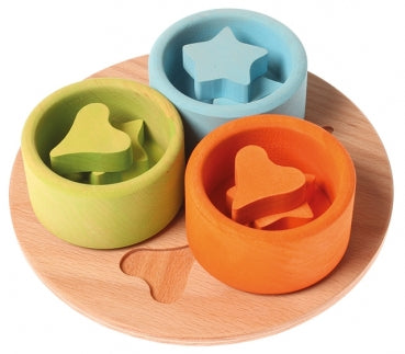 This small sorting game with 3 bowls from Grimms promotes children's fine motor skills and hand-eye coordination. Shapes can be arranged in the recesses in the wooden frame.