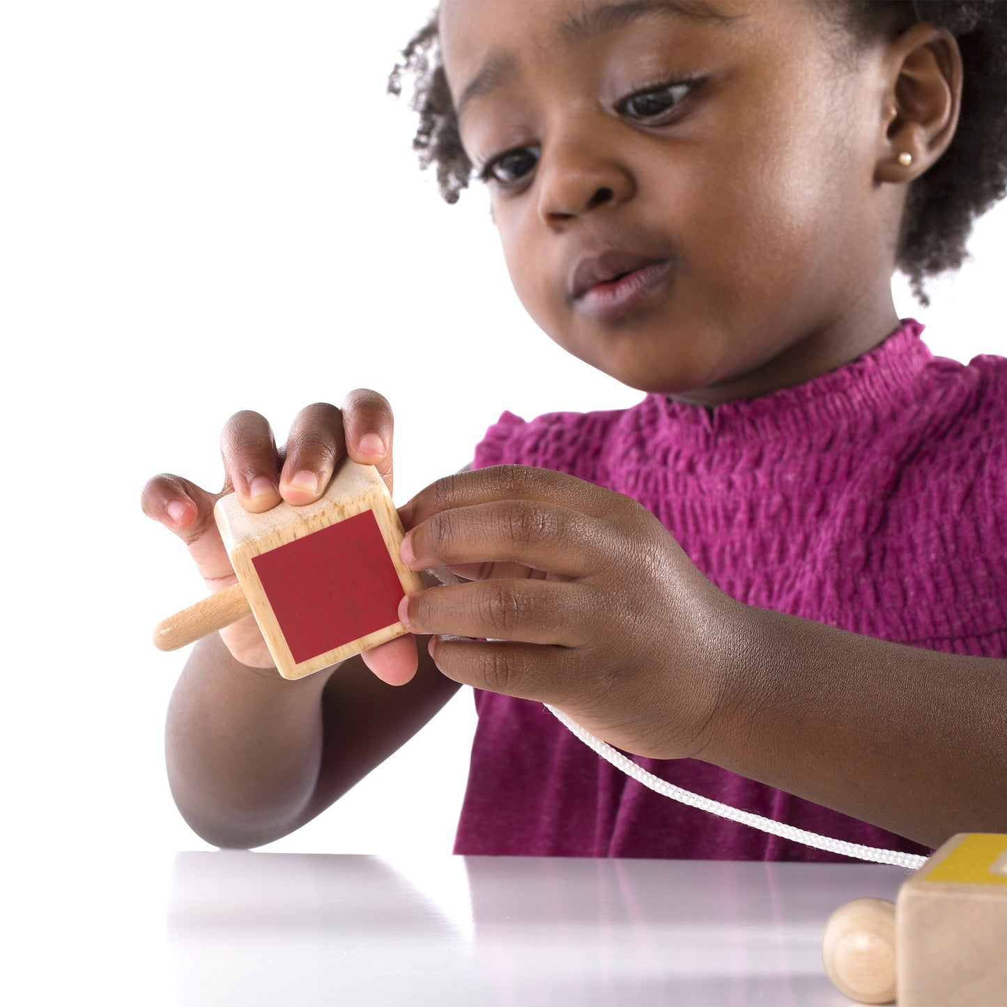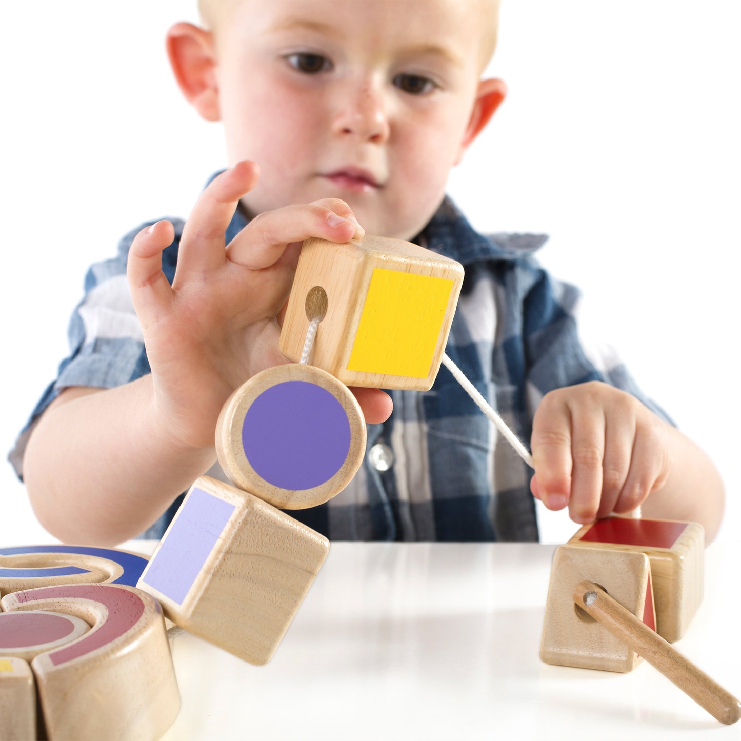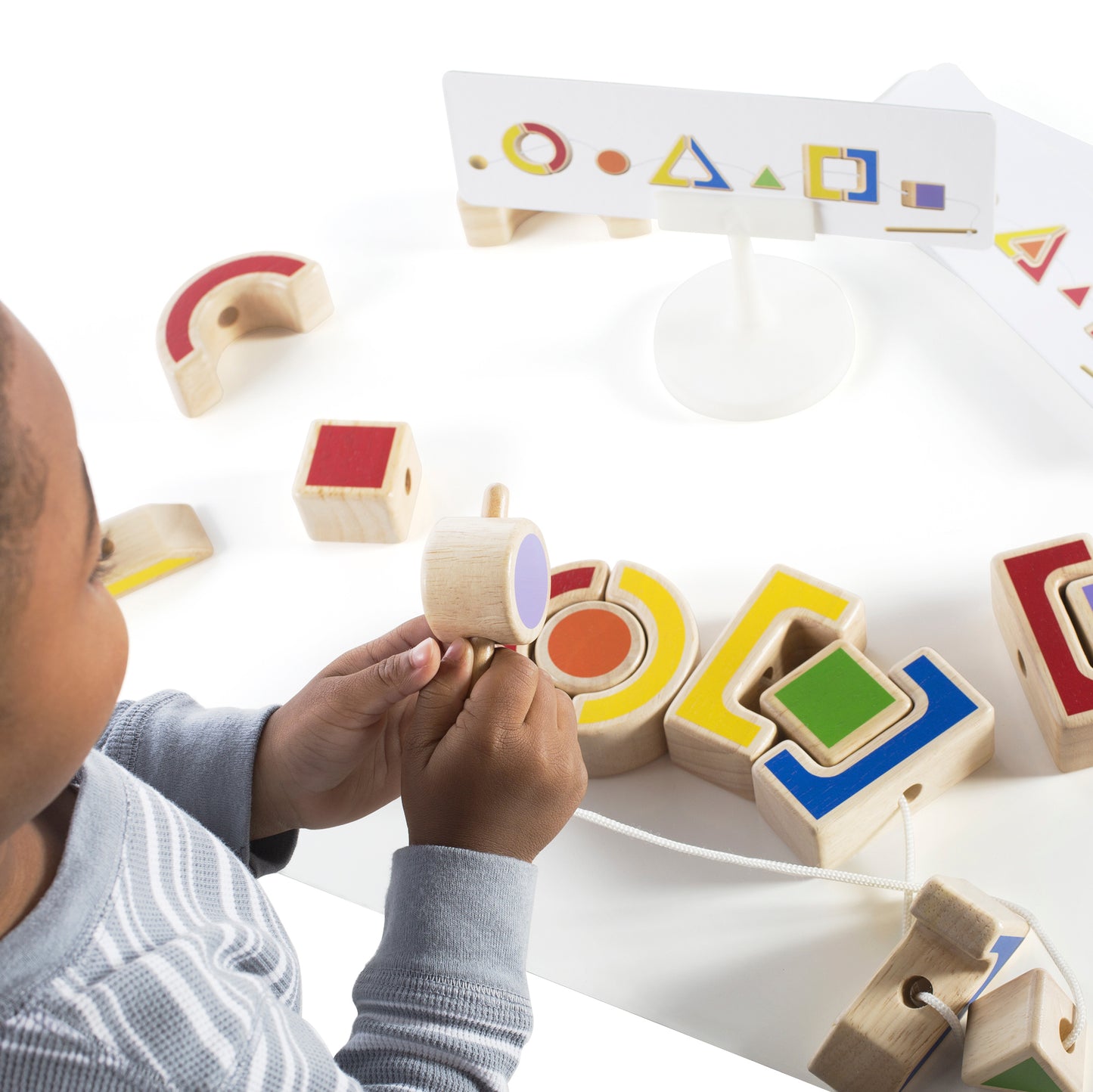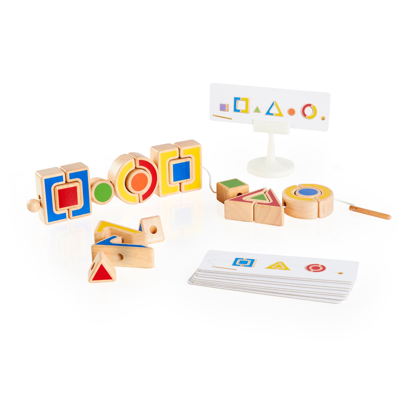 Little hands explore chunky, geometric shapes and the negative spaces between with the colorful blocks of Nest and Lace Shapes. Lacing the chunky rubberwood puzzle pieces, with the patterns on the 12 activity cards, encourages sequencing and matching skills while also subtly introducing color theory concepts. A smooth-sanded dowel helps guide the thread through each shape. Toddlers practice their hand-eye coordination, shape identification and patterning abilities. Activity cards and stand included.