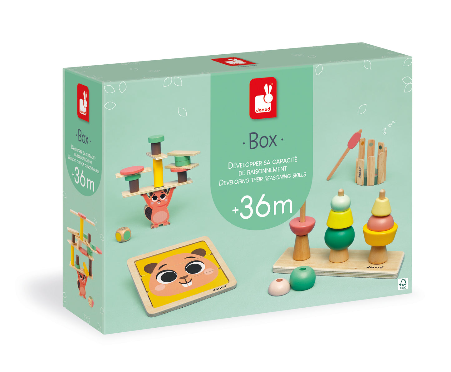 There are 4 Janod Boxes in total (12 months, 18 months, 24 months and 36 months); each of which has been designed specifically for the age range in question. FSCTM wood and cardboard early-learning toy for children aged 36 months and up.