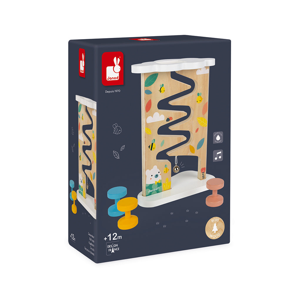 A lovely zig-zag tower in oh-so-soft, very contemporary colours featuring cute animals to promote your baby's motor skills and dexterity. Thanks to the spools that glide along the track, children will develop their visual acuity by following the movement. Your child will spend hours watching the spools roll down to the bottom until they ring the little bell!