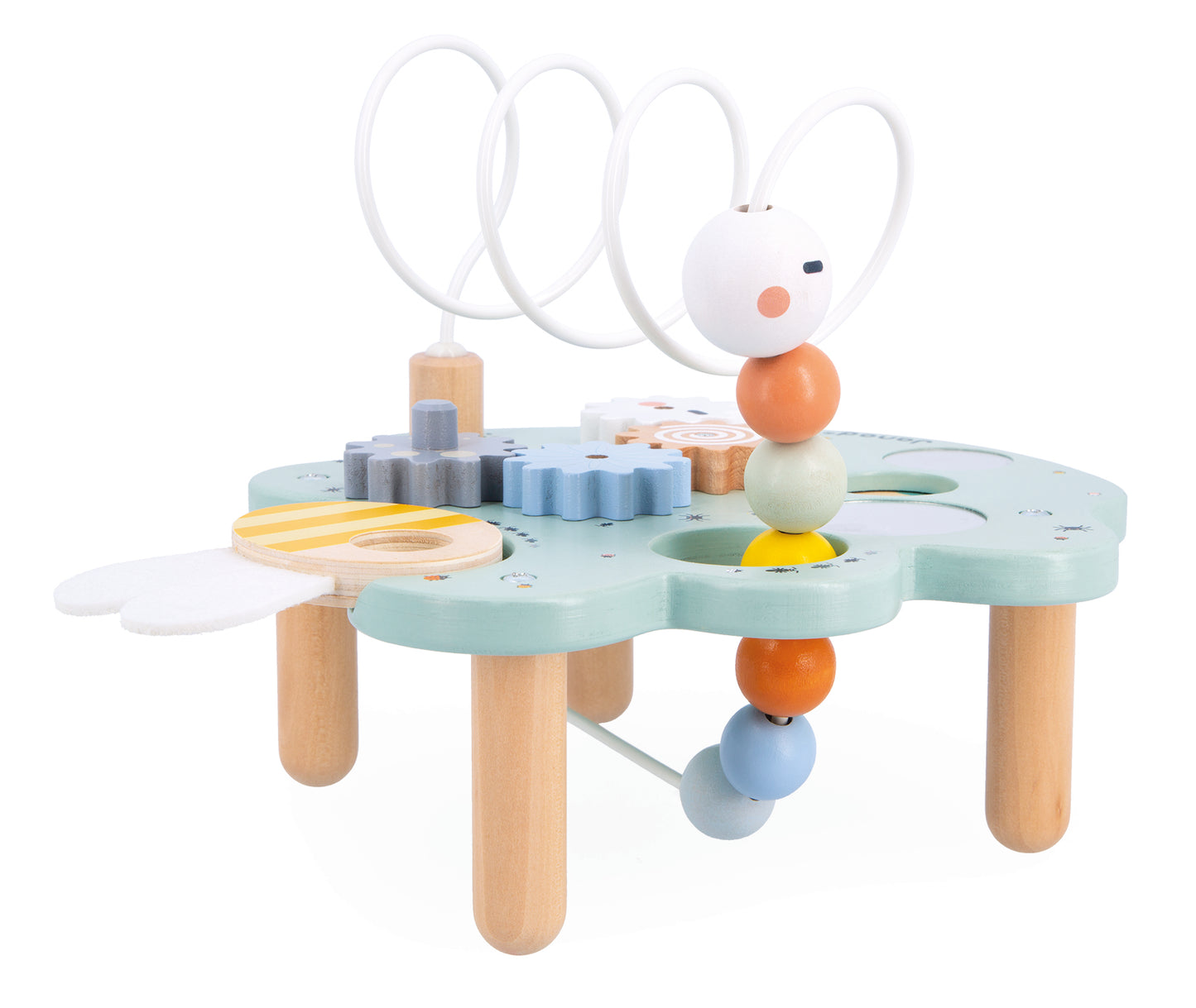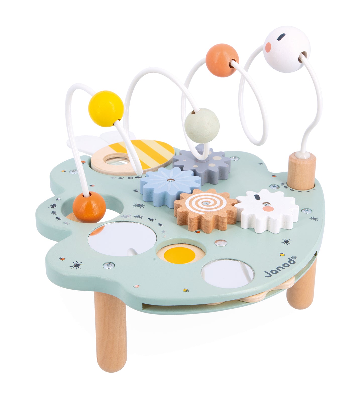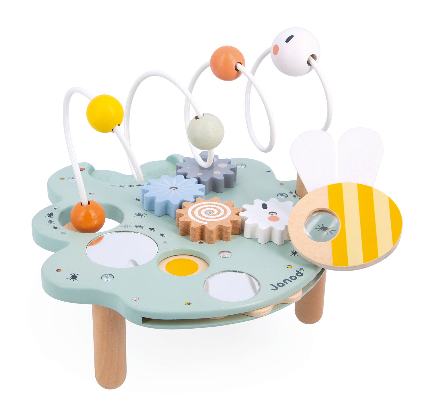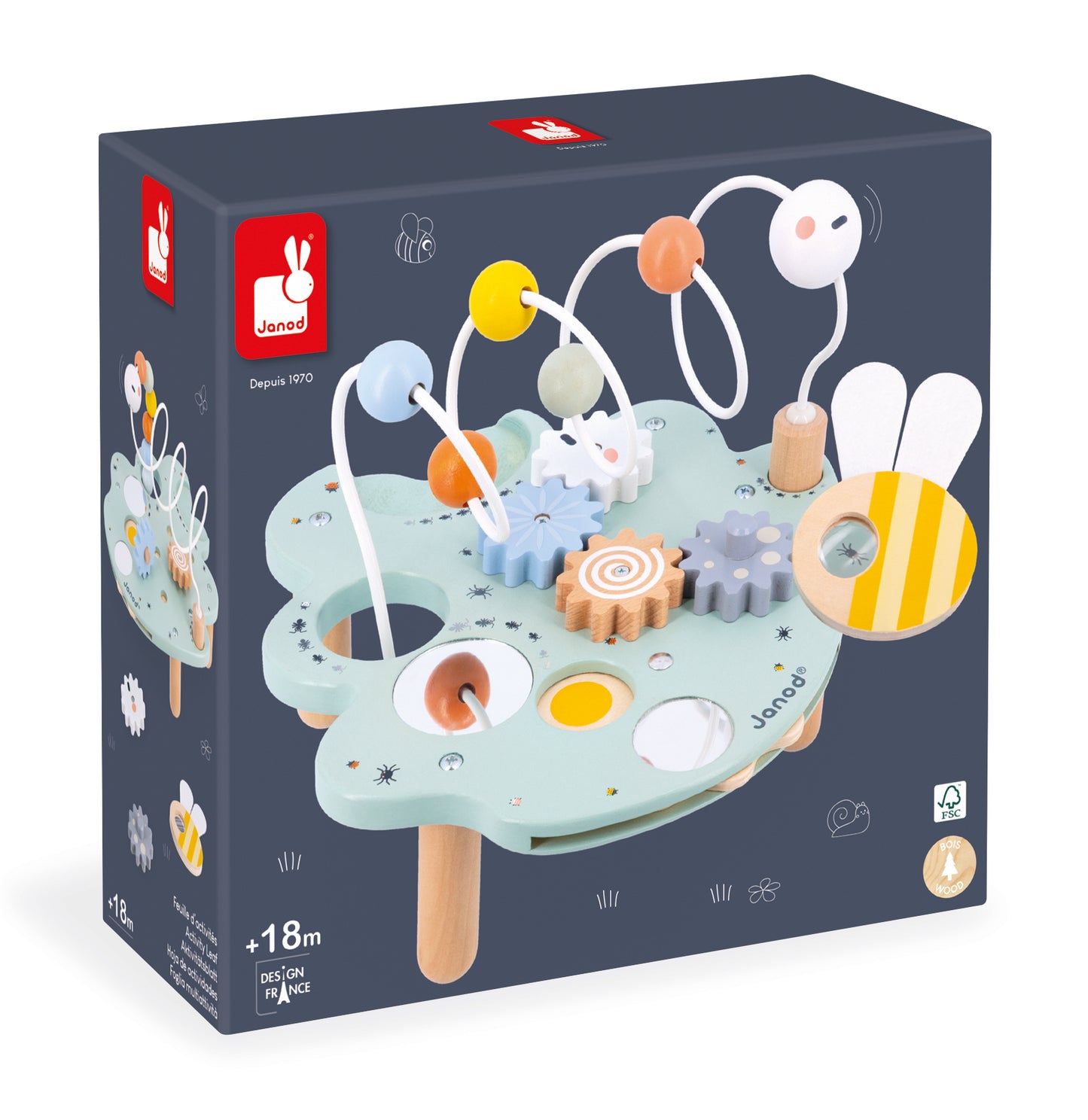 Welcome to Madame Caterpillar’s giant leaf... and I see a greedy little one has already nibbled a piece of it! The full caterpillar can now have fun both above and below the leaf. This leaf offers plenty of activities to keep children occupied: a large looping toy to move the caterpillar around, removable gears, a colour wheel, 3 mirrors and a bee-shaped magnifying glass to get a closer look at all the tiny insects hiding on the leaf! The ideal toy for developing children’s fine motor skills, whilst they learn their shapes and colours. FSC-certified wood early-learning toy for children aged 18 months and up.