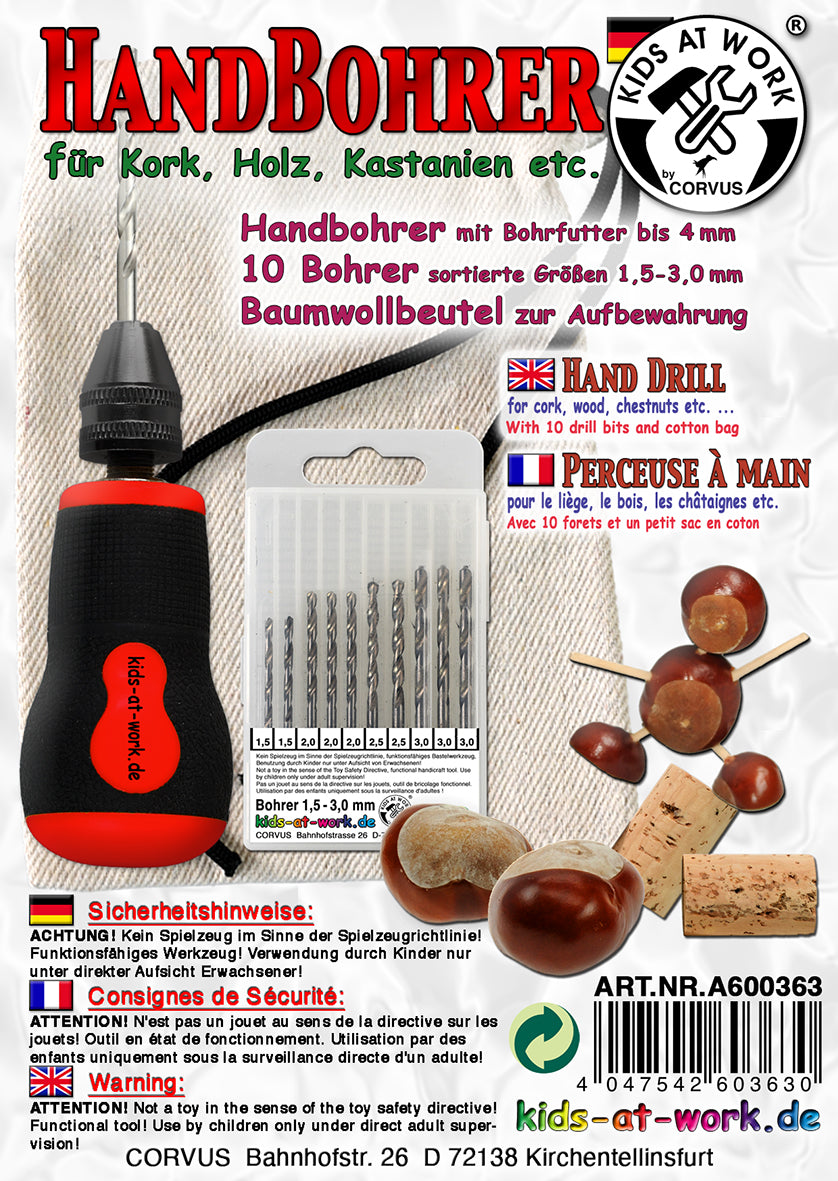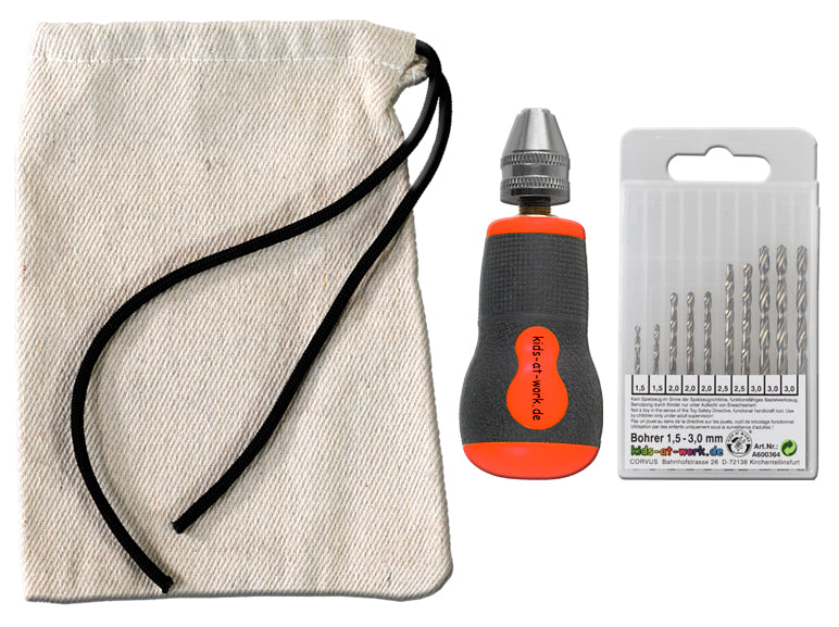 Practical small hand drill (approx. 9 cm long) with drill chuck up to 4 mm. For working with chestnuts, cork, wood and other not very hard materials. Box of 10 drill bits in a practical assortment. Jute bag for storage.