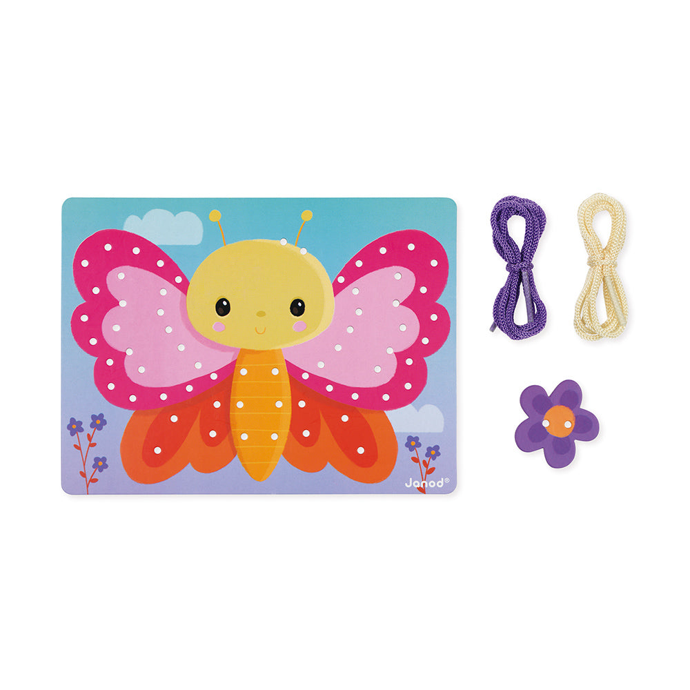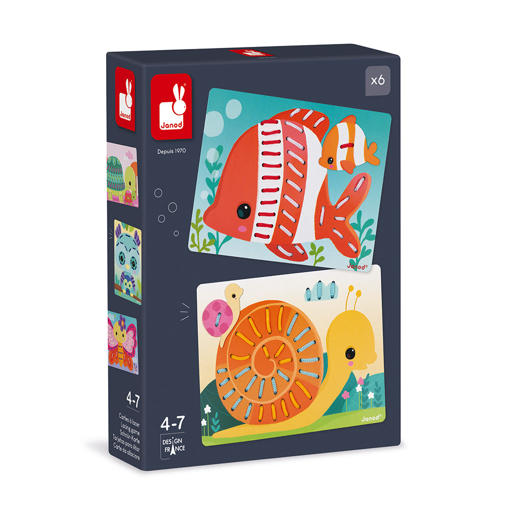 For children aged 4 to 7 years. 6 perforated cardboard cards + 12 different coloured laces + 6 small cardboard pieces. Nicely complete the animals by stringing the laces on the card. Simply follow the numbers. Each animal has two colours of lace! Gift box.