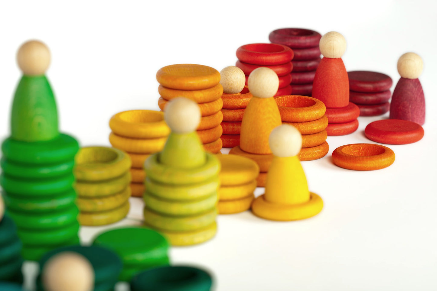 This game allows for the development of logical-mathematical thinking by classifying, grouping and matching elements though colours and/or shapes. These actions improve hand-eye coordination and motor skills. The rings become a material which can be used to thread, pile up and create different games. The Nins can be used as a symbolic game, to create stories and small worlds. In addition to the first pedagogical proposal, this material can be seen from a versatile perspective, which allows for it to be used in a broad number of ways. The adaptability of these materials contribute to creative and divergent ways of thinking.