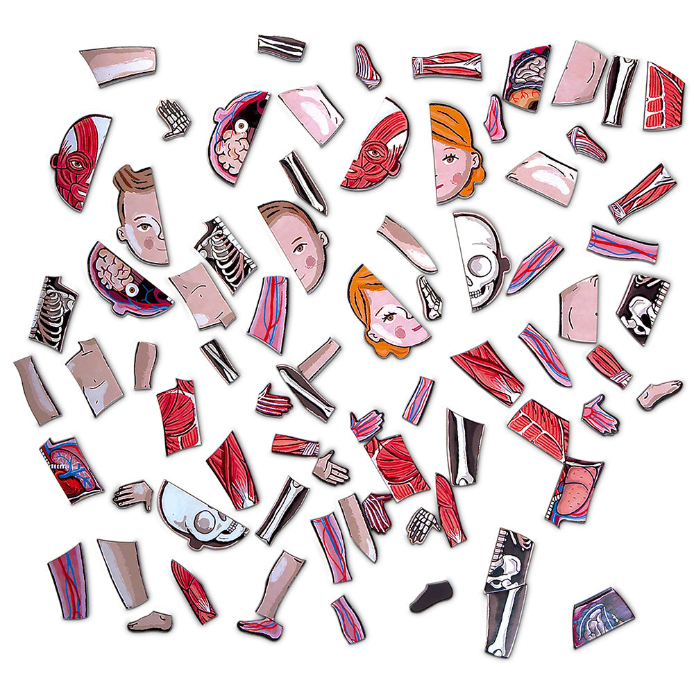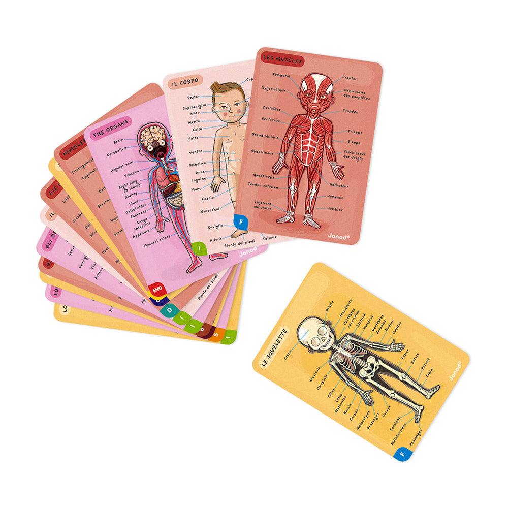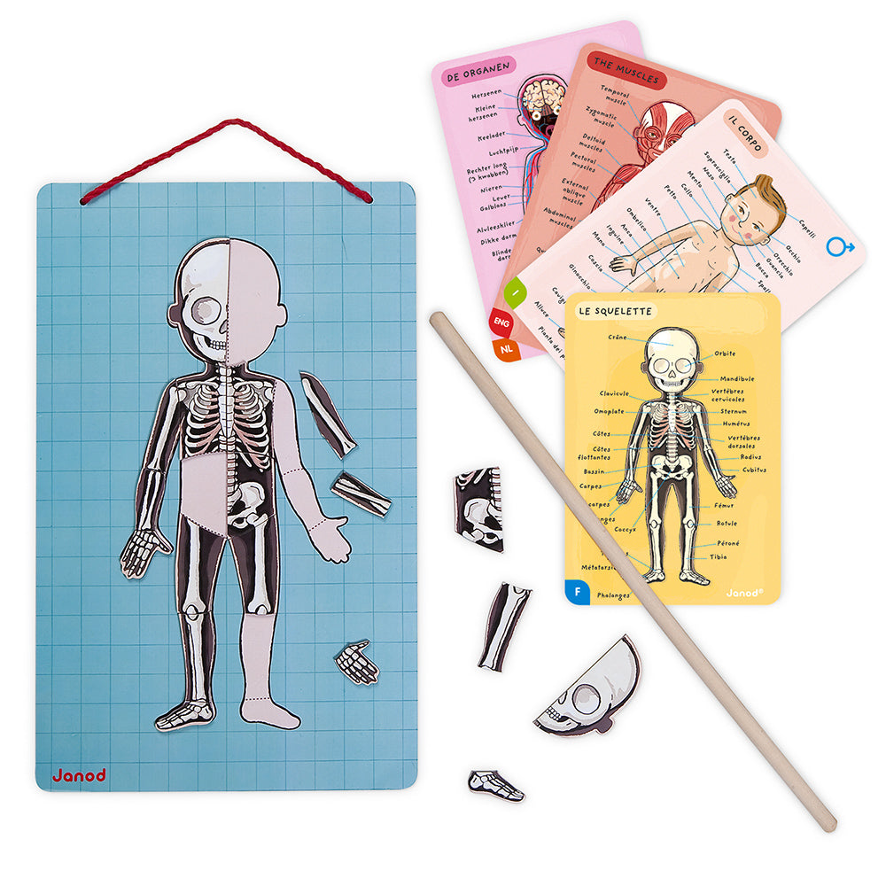 Learn the human body while having fun. 76 magnets and 1 magnetic board to learn and assemble the different parts of the human body. 4 maps with detailed explanations on: the skeleton, the organs, the muscles and the body (cards in French, English, German, Dutch, Spanish, Catalan, Basque, Italian, Russian, Danish, Japanese and Chinese). Comes with a wooden stick.