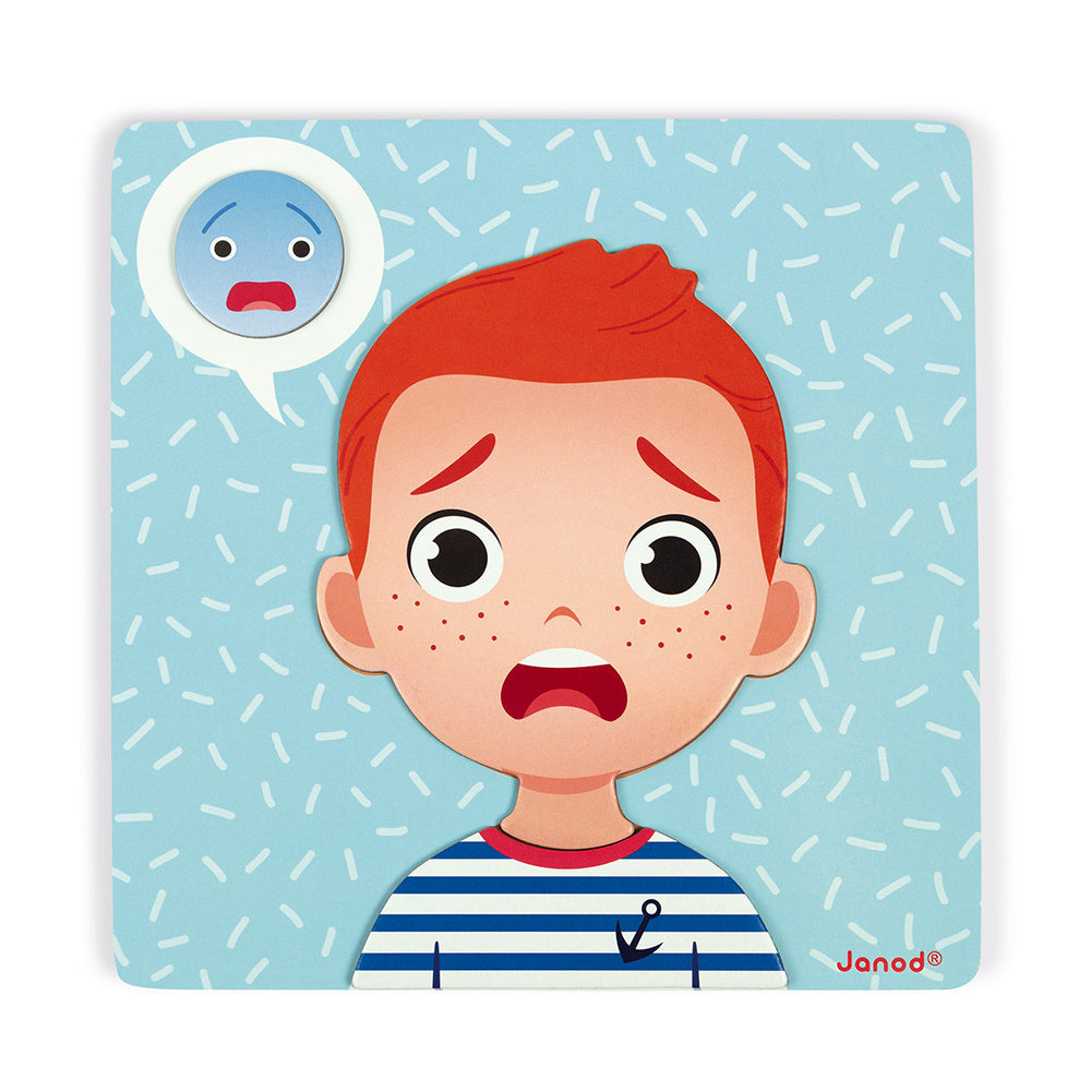 Contains 1 wooden tray, 27 large magnets and 20 situation cards. Includes an emotions guide written by psychomotor therapists. Introduce your child to emotions through the illustrated cards representing various situations from daily life. On the back of each card, there is an answer face that matches the magnets to be used to reproduce the face matching this emotion. 2 play levels: simply reproduce the expression on the back of the card or for older children, try to guess which emotion matches each situation. There is also a mirror in the back of the box so that children practice reproducing and identifying the various emotions. 10 emotions to explore: happiness, fear, sadness, anger, shyness, love, disgust, laughter, jealousy, surprise