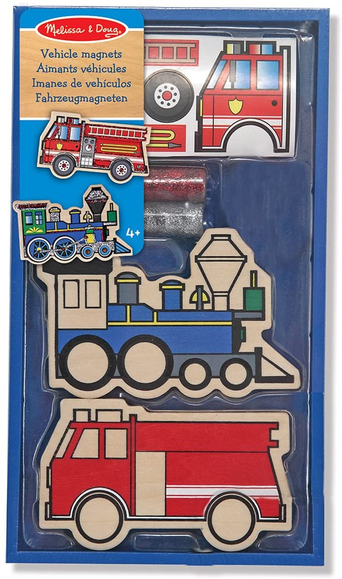 Here's your chance to customize your very own fire or train engine with lots of stickers and two colours of glitter glue! Two wooden vehicles await your design and decoration. This is a great party activity or favour!