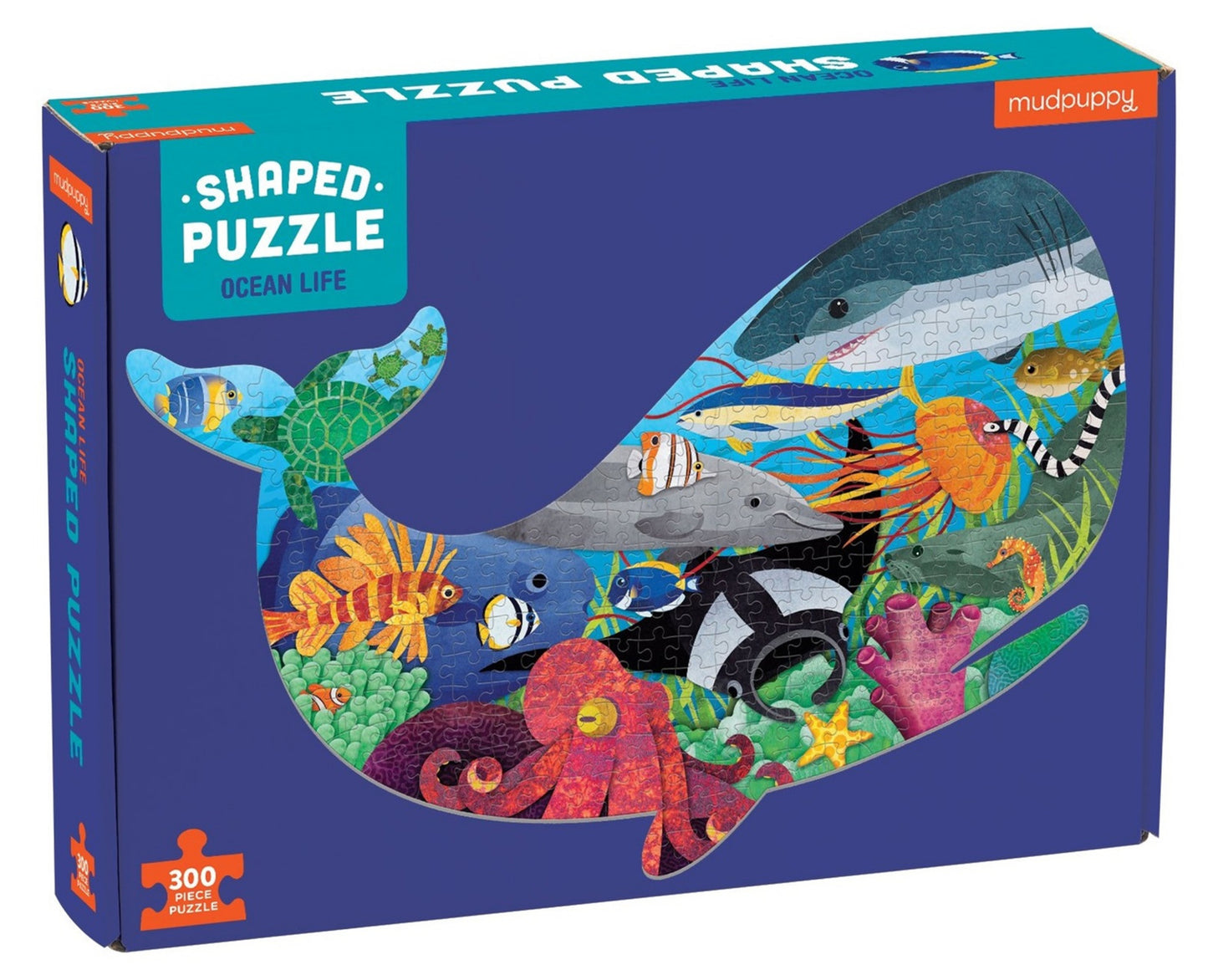 Ocean Life 300 Piece Shaped Scene Puzzle from Mudpuppy features a colorful scene of underwater sea animals. The finished puzzle is die-cut in the shape of a whale adding wow-factor when completed.