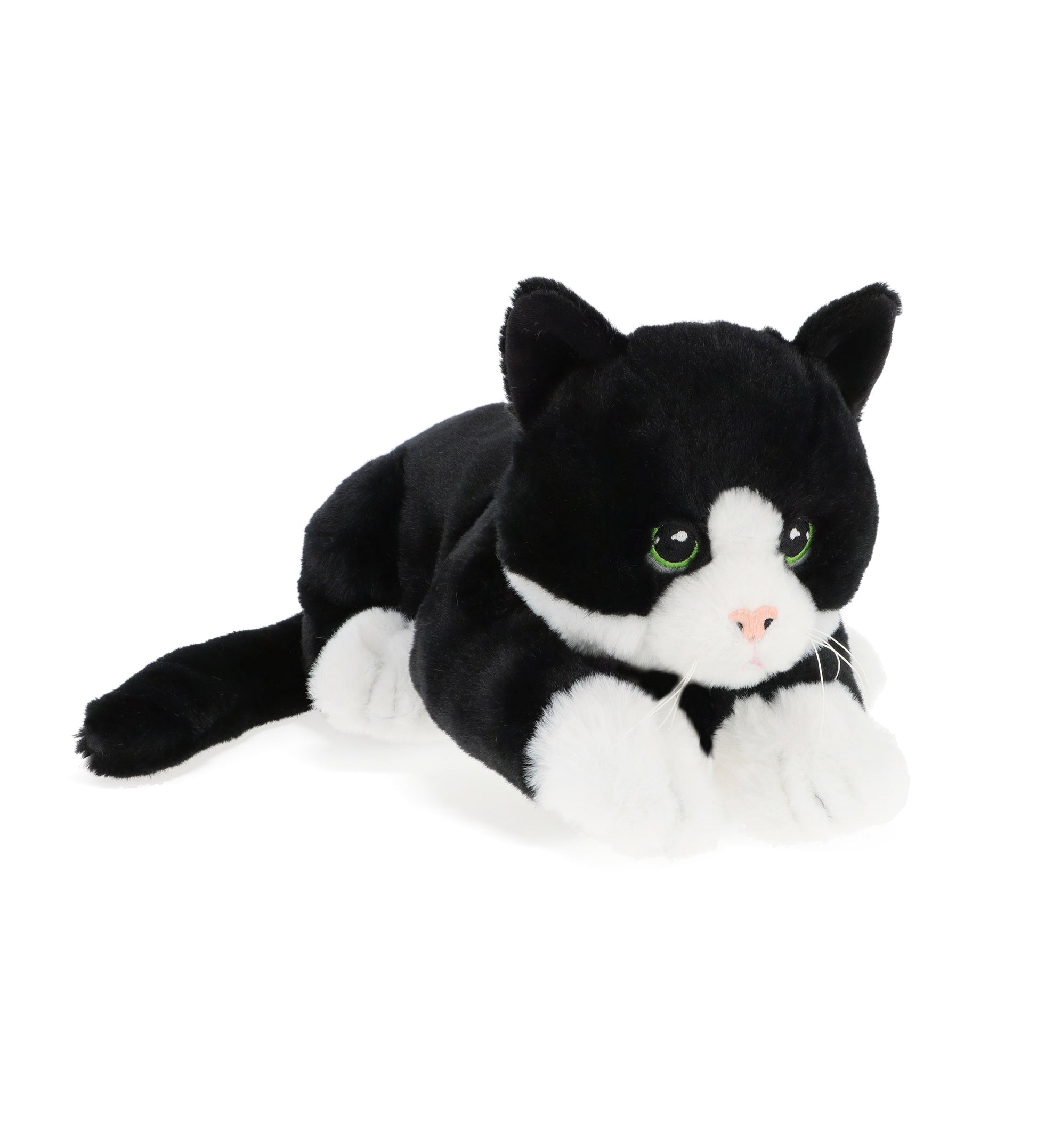 These soft toys are manufactured and filled with 100% recycled polyester made from plastic waste and feature the 4 classic cat colours of white, black & white, ginger and grey striped.