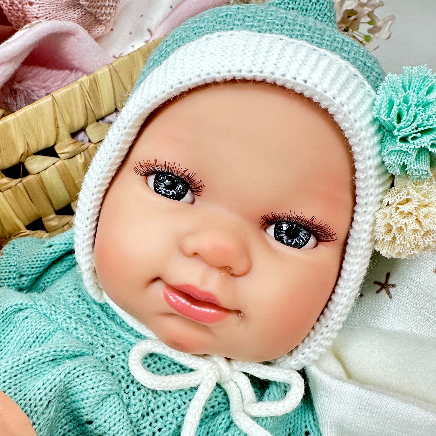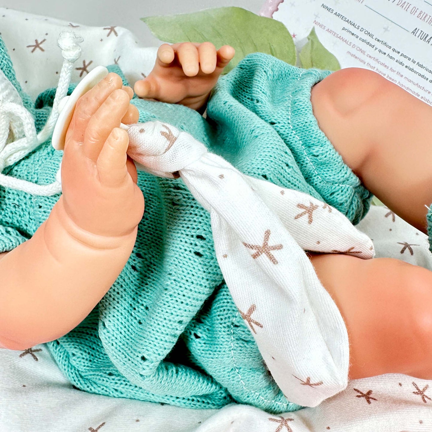 With a jointed and scented vinyl, anatomically correct body, beautiful eyelashes, and a little snot and dribble, he is waiting for you to get to know him and give him the care he needs!  Incredible detail which shows some redness on the skin. Soft blanket, soother and birth cert are also included.
