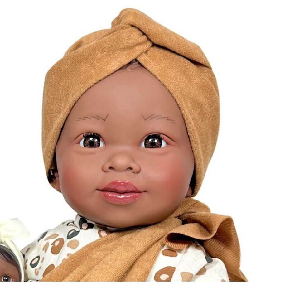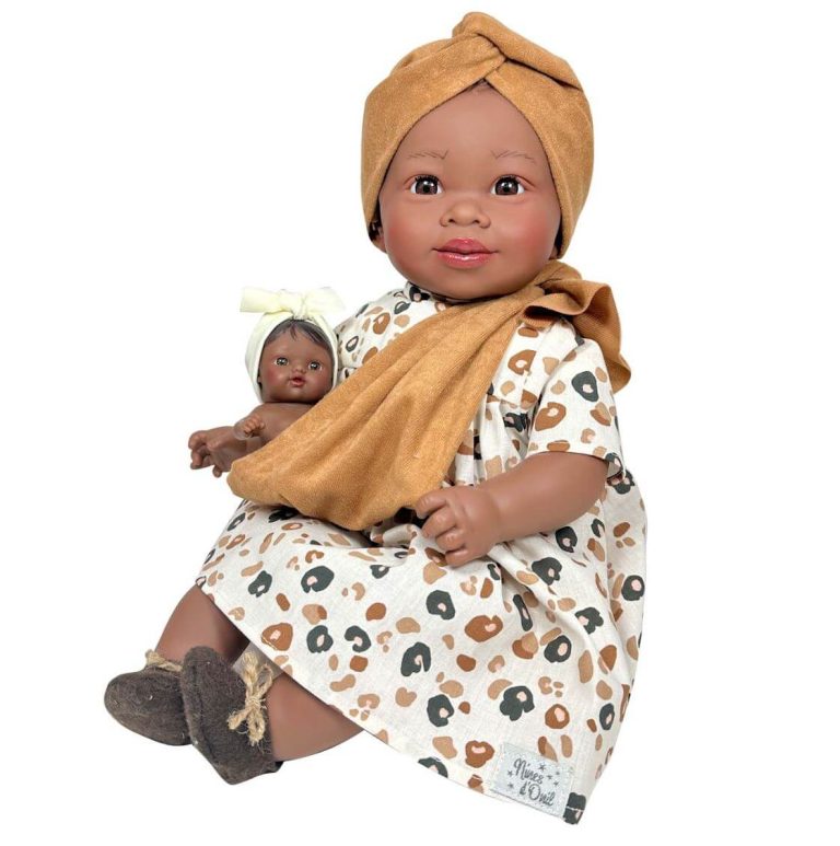Maria is a soft-bodied doll that includes a baby to interact with during play. She has beautiful short curly hair, an animal-print outfit and an ochre turban that matches her baby's muslin cloth. Her legs, hair and arms are made of vinyl. This model opens and closes her eyes. Her vanilla scent creates a perfect atmosphere of well-being for any child.