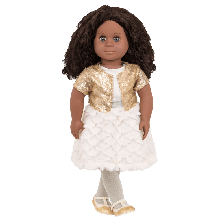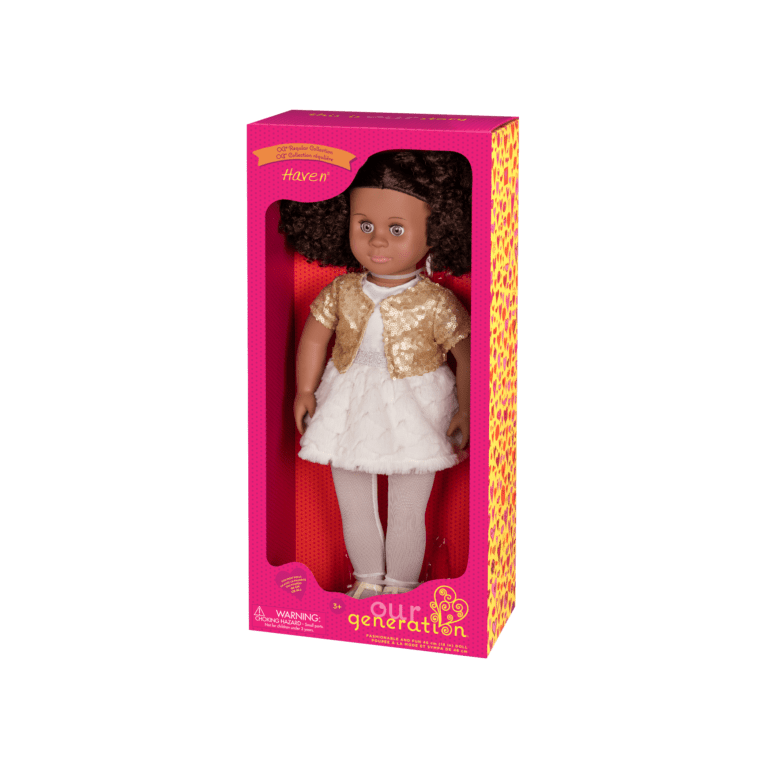 Put a holiday twinkle in your eye and some seasonal sparkle in your step with Our Generation Regular 18-inch Holiday Doll – Haven, a beautiful non-posable doll with long, curly brown hair and unique gray eyes. Celebrating the holidays is what Haven does best, and she loves spending the festive time of year with her friends and family!