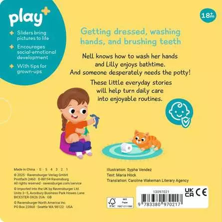 Let’s learn about daily care! Enjoy exploring and talking about everyday routines together in this 12-page book with playful sliders. Includes parenting guide on each page. Nell washes her hands and Mai brushes her teeth. This first slider book guides children from 18 months and older through daily routines in a playful way. Learn about habits that encourage everyday hygiene in Me and My Day…Daily Care – as you read, find out about what children in the book do to keep clean, tidy their room and brush their teeth. Me and My Day…Daily Care includes some handy parental tips too.