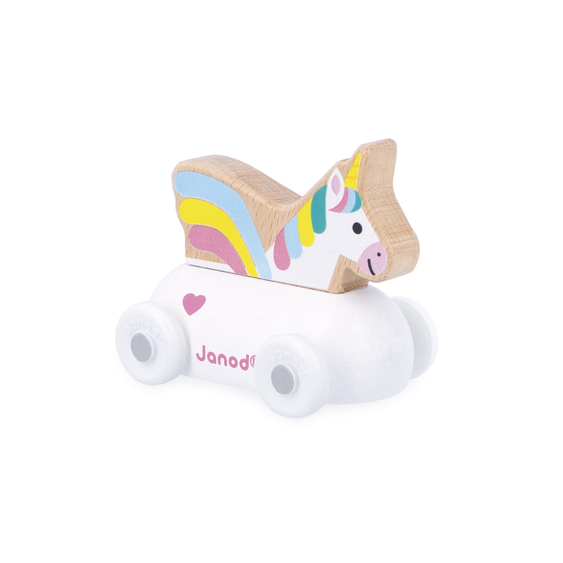 This white unicorn with a multicoloured mane is ready to go on some great adventures. The push-along vehicle has been designed with an easy-to-grip shape. Toy made from FSC™ wood for children aged 12 months and up. Combine this push-along car with its mat and cool block set in the same Janod range to perfectly complete the universe - Sold separately.