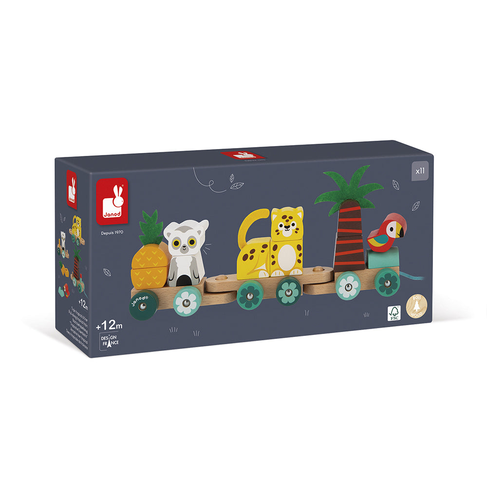 We’re off on an adventure in the tropical forest! Your child will love this train with its 3 removable carriages. They can stack the 11 pieces in the set to make a parrot, a palm tree, a jaguar, a lemur and a pineapple. With its cotton string to help baby pull the train along, it’s just the thing for getting them walking. This toy is ideal for developing fine motor skills and hand-eye coordination. Water-based paint. Made of FSCTM-certified wood. Pull-along toy for children from 12 months onwards. To create this range, we set out for the tropics in search of an escapist, exotic and contrasting atmosphere. To best illustrate this wild nature, we have brought together cheerful animals in vibrant colours and plant elements in soothing hues.