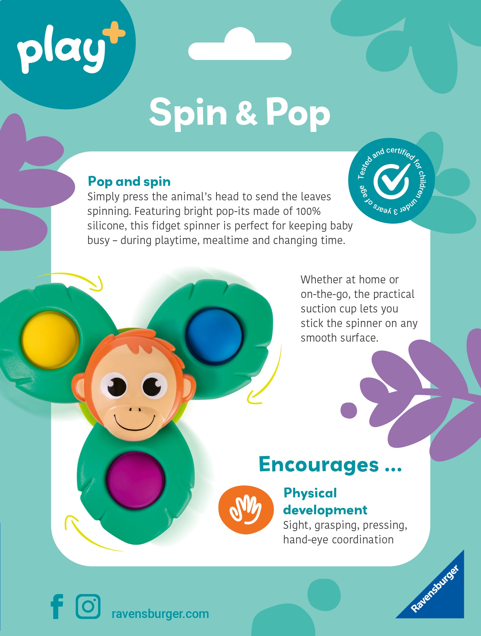 Your baby will have lots of fun with this colourful spinner. Simply press the animal’s head to send the leaves spinning. Featuring bright pop-its made of 100% silicone, this fidget spinner is perfect for keeping baby busy – during playtime, mealtime and changing time. Whether at home or on-the-go, the practical suction cup lets you stick the spinner on any smooth surface.