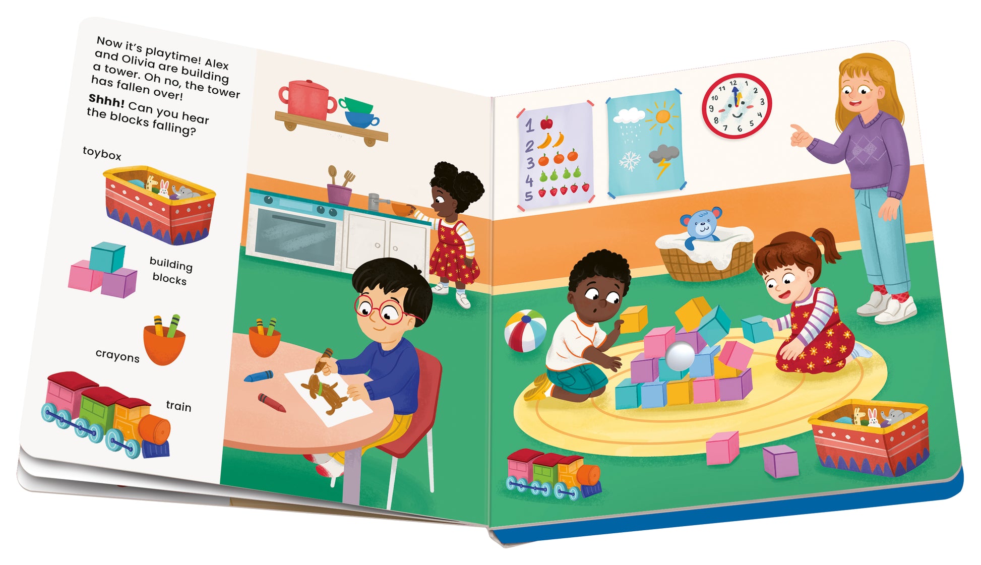 Have fun discovering the different sounds in nursery with this colourful search and find book. Press the buttons to bring the nursery to life and help children recognise the different noises they might hear, preparing them for what to expect in the nursery setting. This 12-page book is great to enjoy together or for independent play and discovery to prepare little ones for different environments either in nursery, playgroup or pre-school.