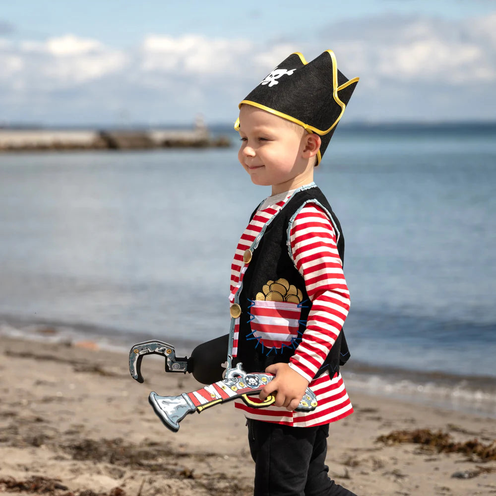 Captain Stripe's pistol is essential for a pirate captain, as all men and women at sea love shooting duels, gunpowder, and bullets. The pistol is made up of old tin cans and fittings salvaged from Captain Stripe's shipwreck. To ensure that the pistol does not break, it is lashed together with a piece of the ship's striped mainsail.